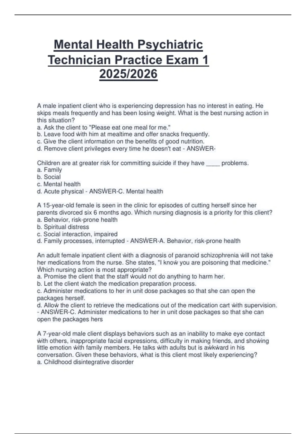 Psychiatric Mental Health Nursing Latest Exam Version 2025/2026 Most Comprehensive To Pass (Psychiatric Mental Health Nursing) Exam Study Guide Questions And Answers 2025/2026 Latest Exam Practice (Roles And Functions Of Psychiatric Mental Health Nurses Competent Caring) 100% Guaranteed Pass 2025/2026 Psychiatric Health Nursing Exam Practice With C