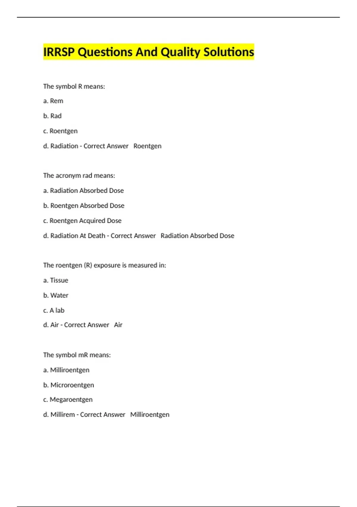 IRRSP Questions And Quality Solutions,IRRSP Practice Test Solved,IRRSP - RADIOGRAPHY STATE CARD EXAM ANSWERED CORRECTRY,IRRSP Test Questions Xray NDT/NDE Answered And Graded || A+ Rated,IRRSP- Study Guide Questions And Complete Solutions,ASNT Industrial Radiography Radiation Safety Questions Answered And Graded