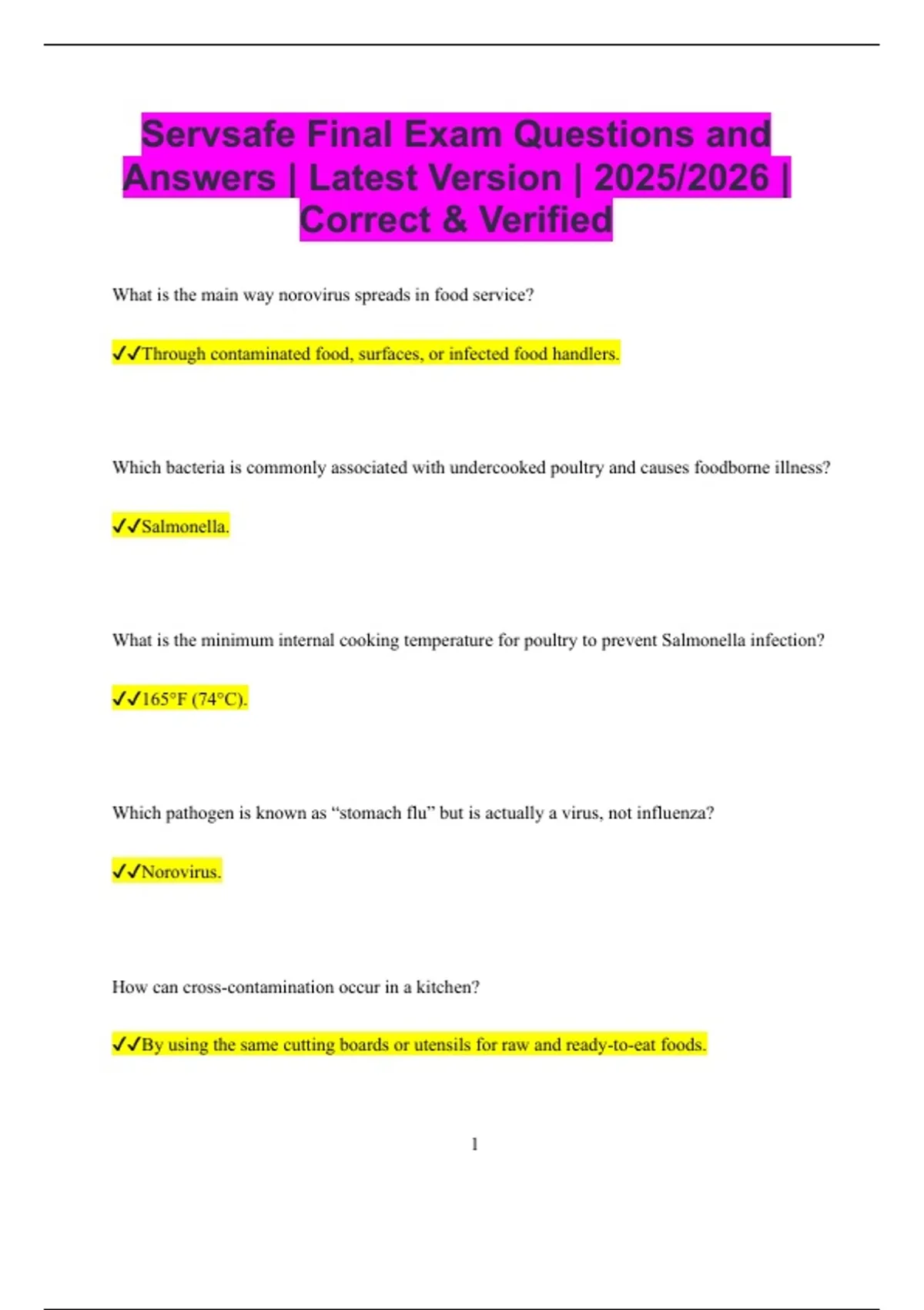 Servsafe Food Handler Guide Test Questions and Answers | Latest Version | 2025/2026 | Correct & Verified