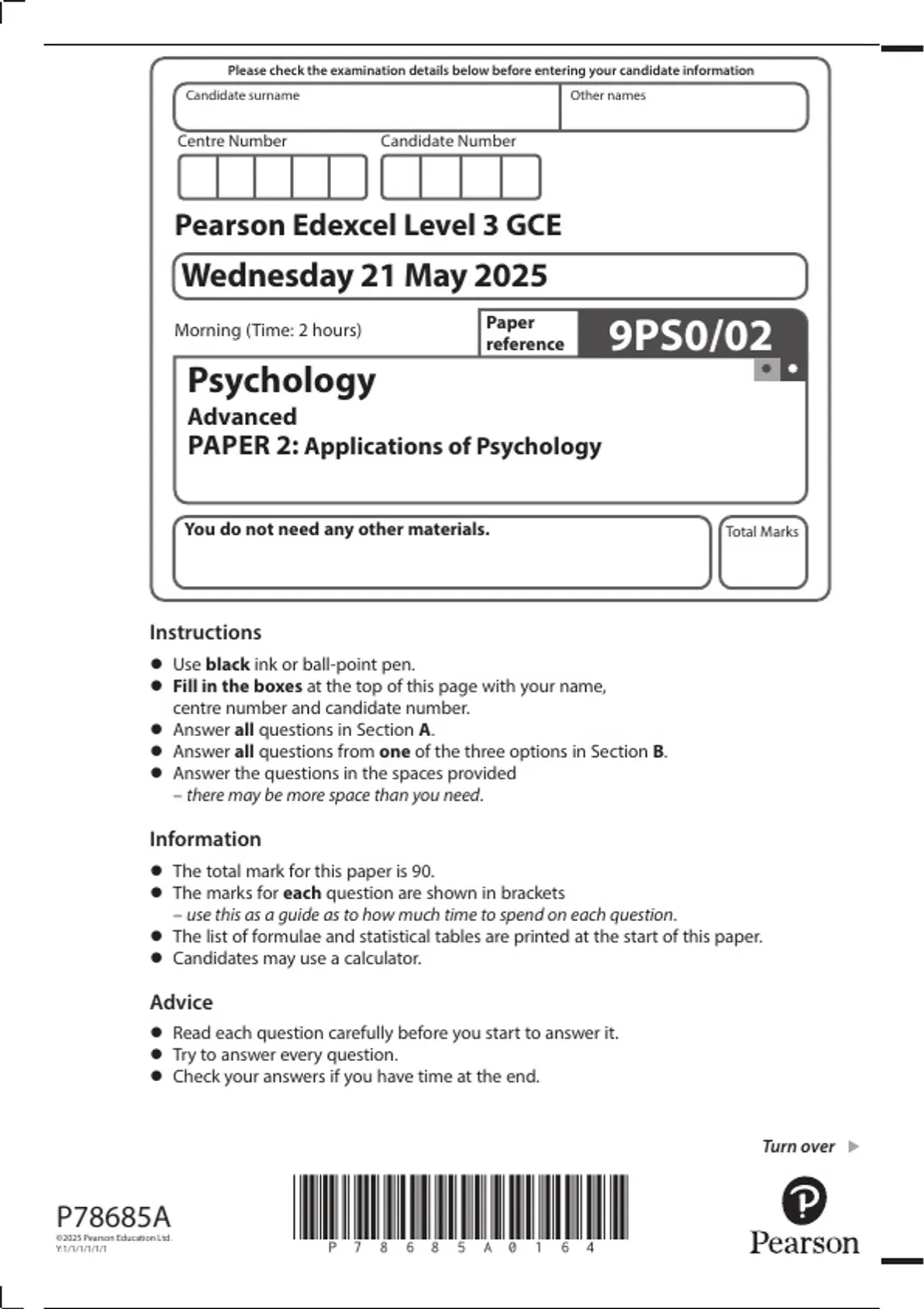 2025 Pearson Edexcel AS Level GCE Psychology PAPER 2 QUESTION PAPER AND FINAL MARK SCHEME