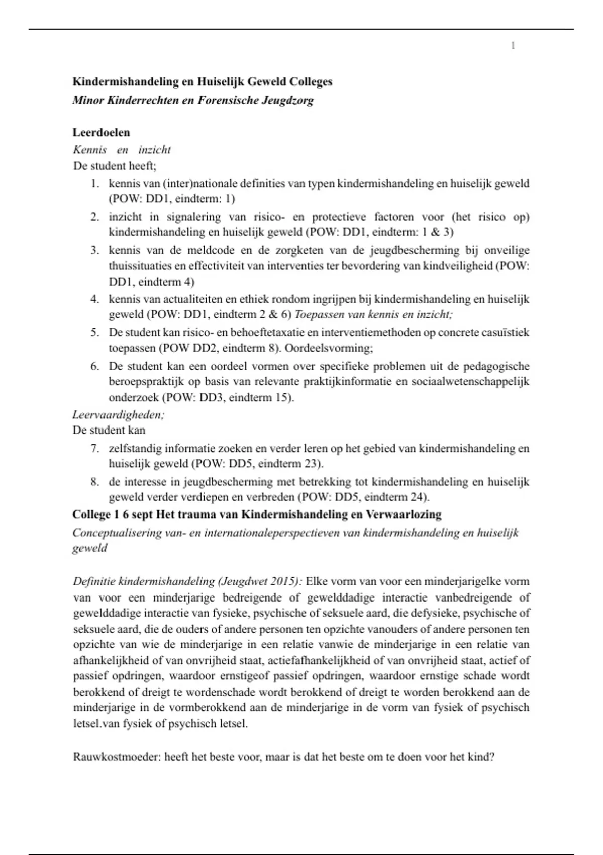 Samenvatting colleges en boek, kindermishandeling (Minor Kinderenrechten en Forensische Jeugdzorg)