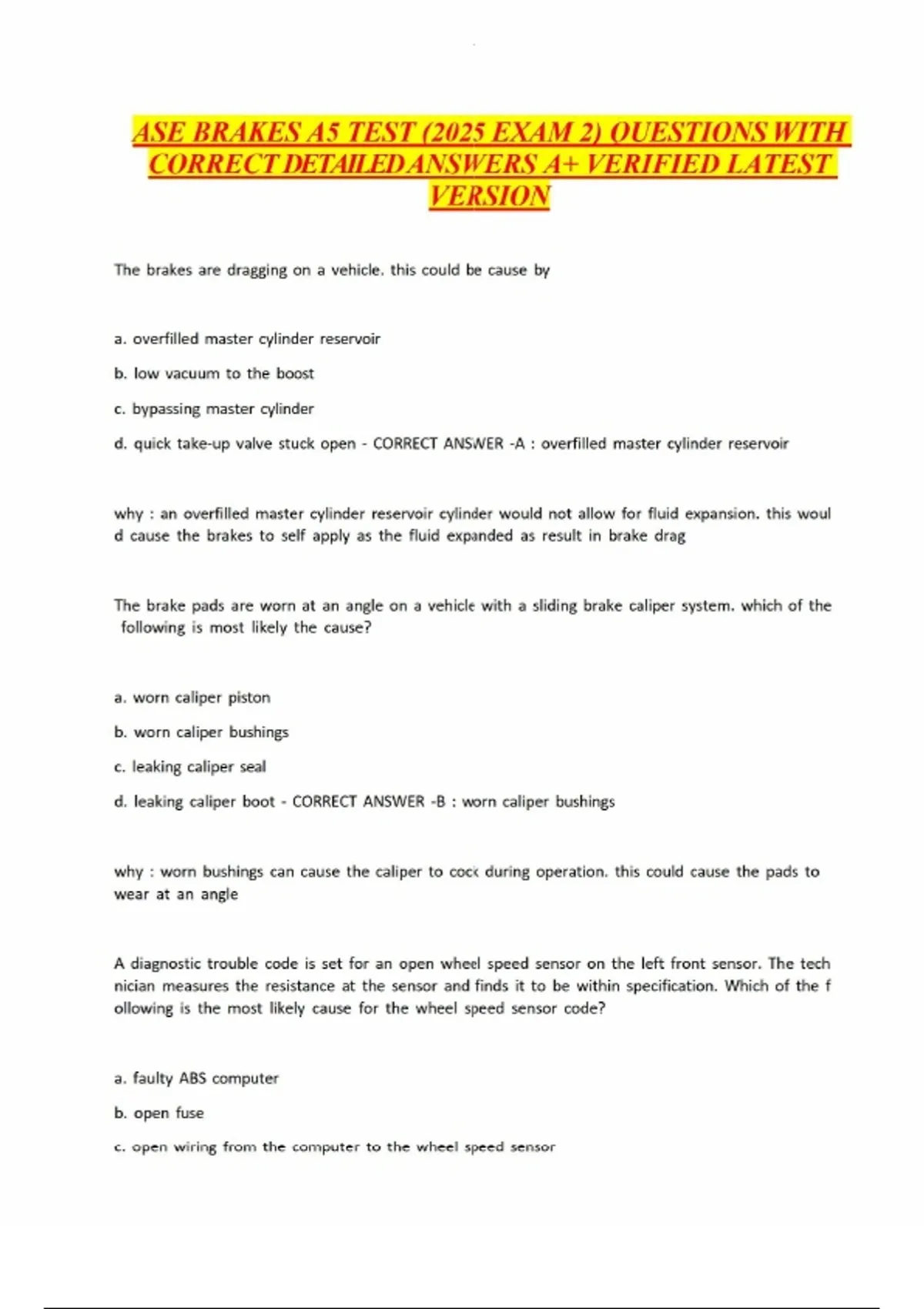 ASE BRAKES A5 TEST (EXAM 2) QUESTIONS WITH REVISED CORRECT ANSWERS VERIFIED A+ LATEST UPDATE 2025 The brakes are dragging on a vehicle. this could be cause by a. overfilled master cylinder reservoir b. low vacuum to the boost c. bypassing master cylinder d. quick take-up valve stuck open - CORRECT ANSWER -A : overfilled master cylinder reservoir