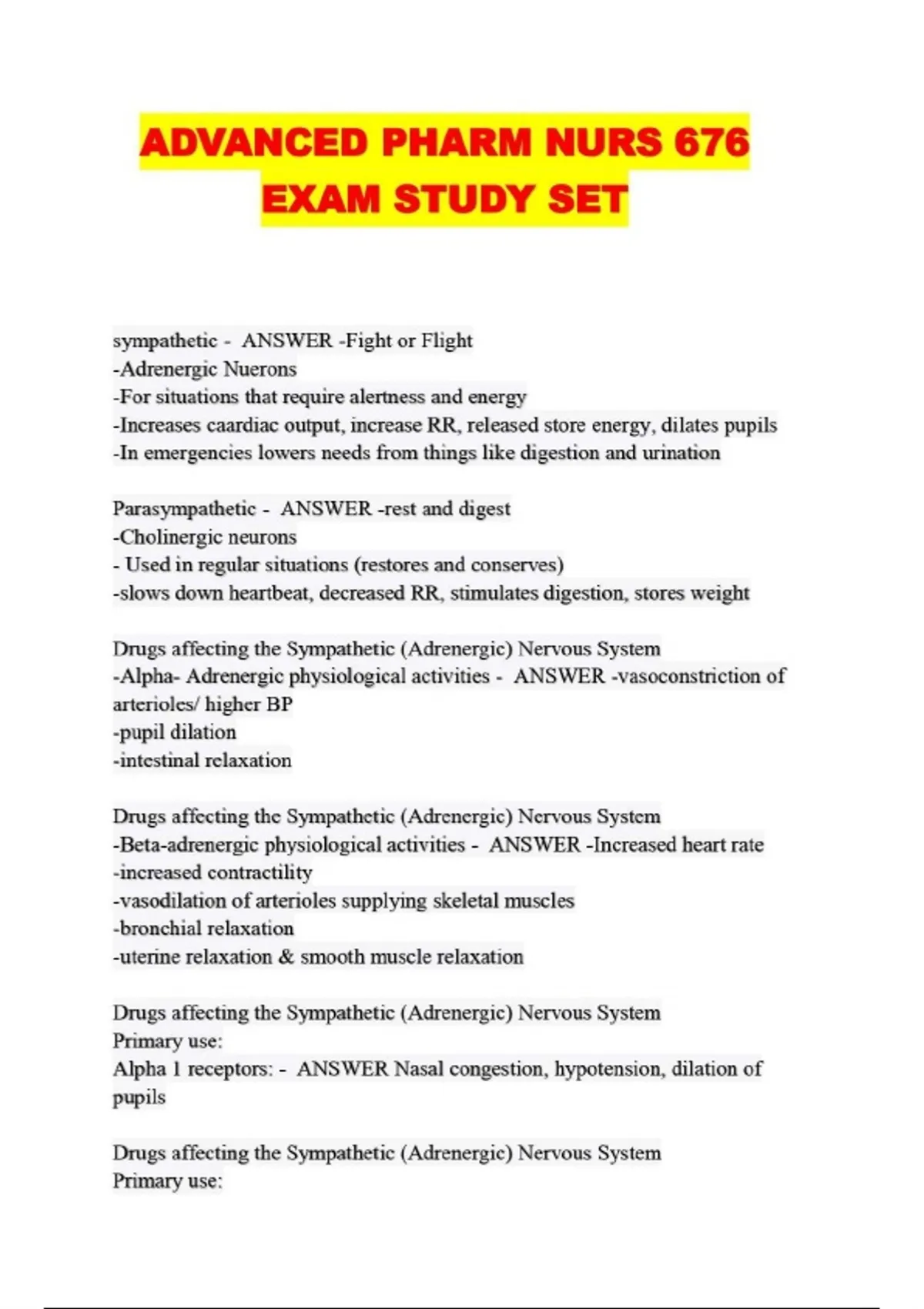 ADVANCED PHARM NURS 676 EXAM STUDY SET