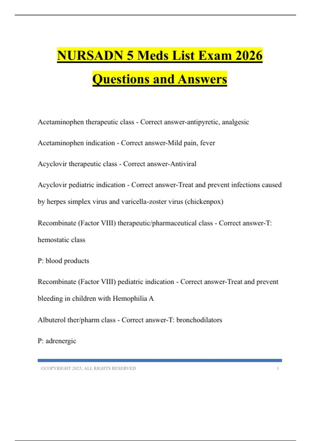 NURSADN 5 Meds List Exam 2026 Questions and Answers