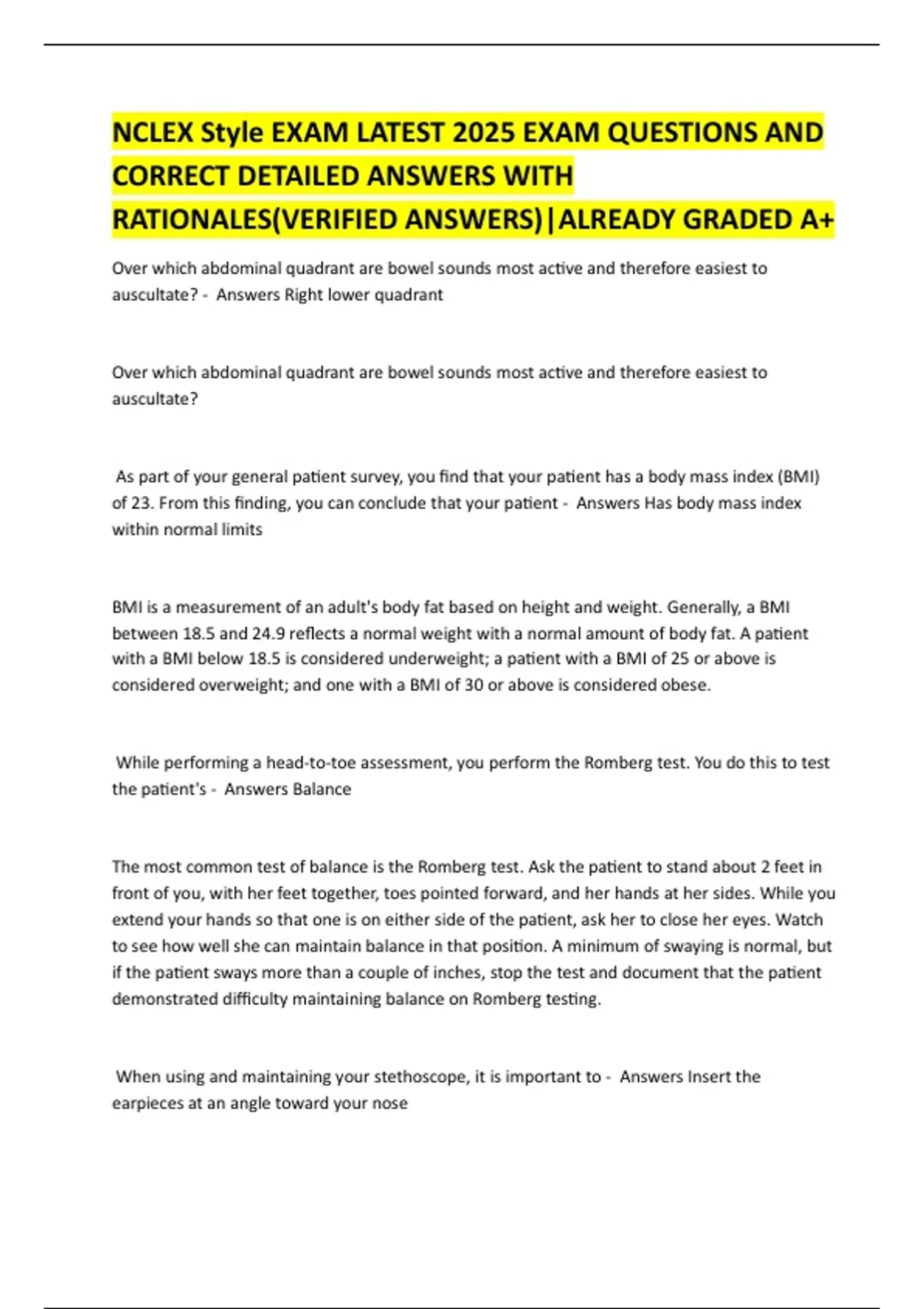 Exam (elaborations) NCLEX EXAM NCLEX-PN 2 Exam (elaborations) NCLEX Ques on Bank with Ra onales 2025/2026 NCLEX Ques ons I've found or received daily from free resources, and Archer trial I paid for. You've got this!!! :) With complete solu on New RATED A+ 100% VERIFIED CORRECT 3 Exam (elaborations) NCLEX Question Bank with Rationales 2025/2026 1