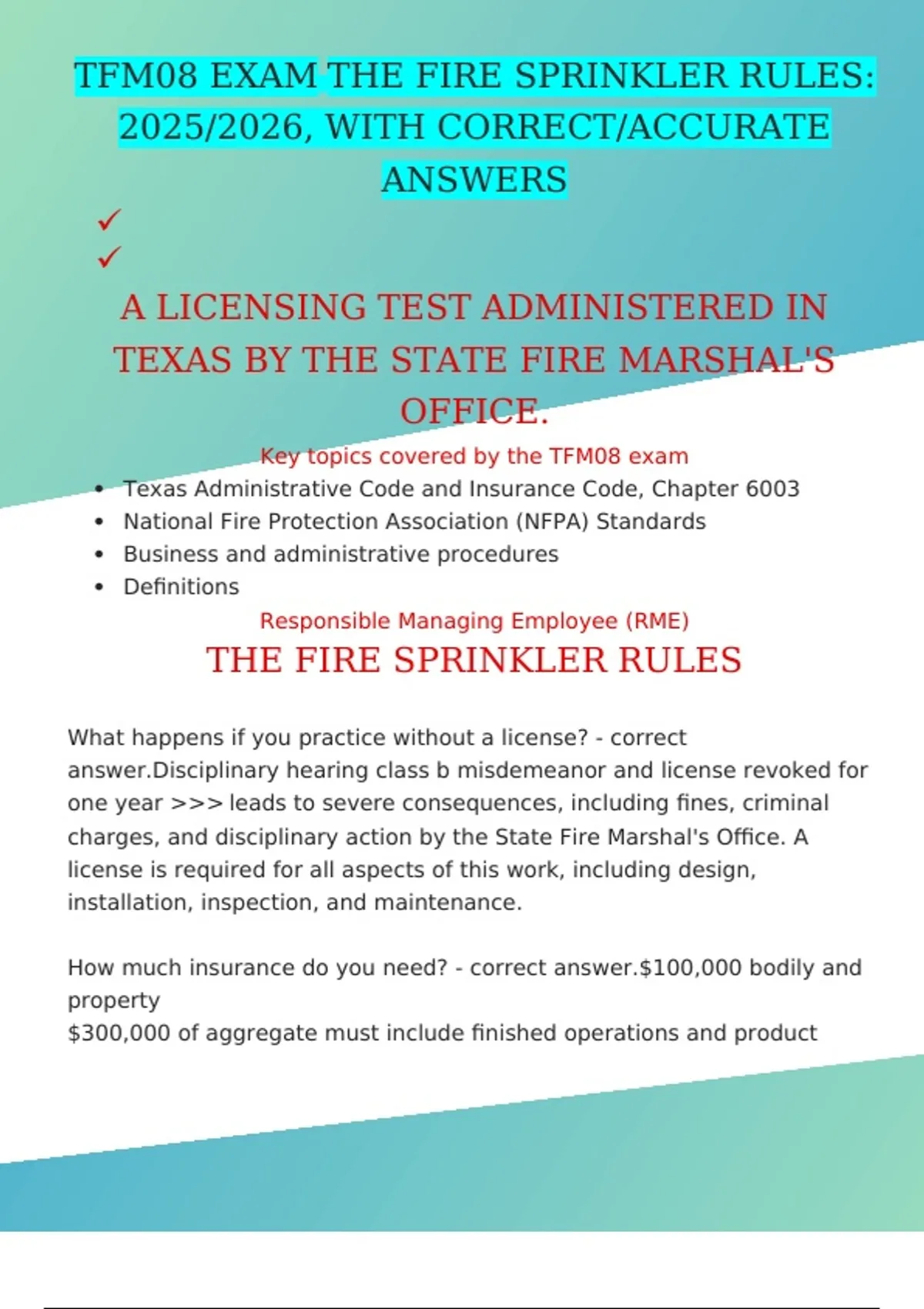 TFM08 EXAM THE FIRE SPRINKLER RULES: 2025/2026, WITH CORRECT/ACCURATE ANSWERS TFM08 EXAM TEXAS FIRE MARSHAL: 2025/2026 WITH CORRECT/ACCURATE ANSWERS TFM08 TEXAS FIRE MARSHAL EXAM: 2025/2026 WITH CORRECT/ACCURATE ANSWERS TFM08 EXAM: TEXAS FIRE MARSHAL 2025/2026 WITH CORRECT/ACCURATE, ANSWERS