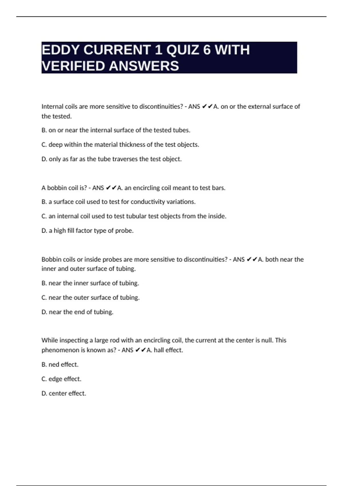 1 Exam (elaborations) Eddy Current Testing NDT classroom questions and answers 2 Exam (elaborations) Eddy Current Testing NDT classroom questions well answered already passed 3 Exam (elaborations) Eddy Current Testing questions with complete solutions 4 Exam (elaborations) Eddy current level 2 quiz with correct answers 5 Exam (elaborations) NDT