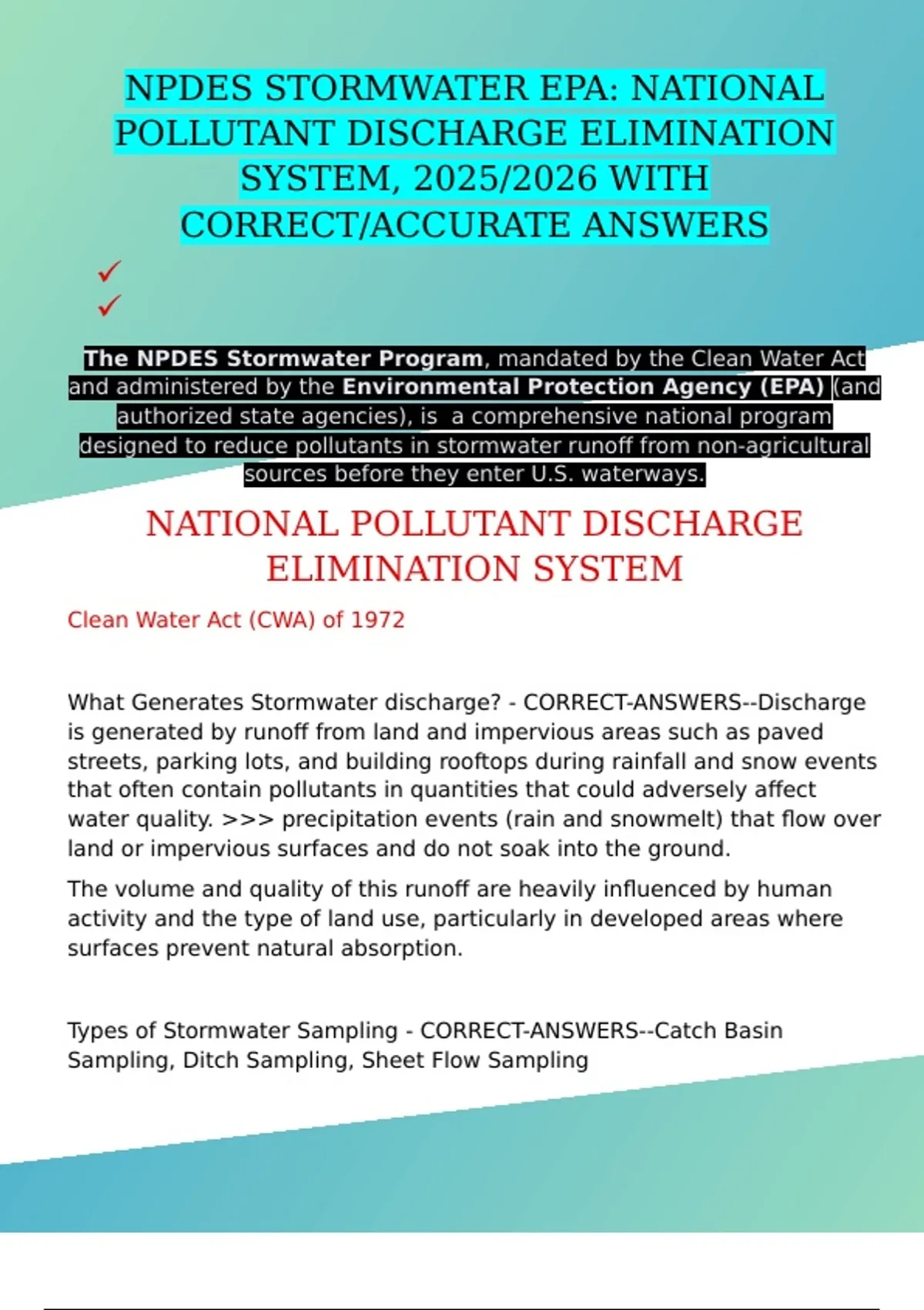 NPDES EROSION AND SEDIMENT CONTROL: NATIONAL POLLUTANT DISCHARGE ELIMINATION SYSTEM, EXAM 2025/2026 WITH CORRECT/ACCURATE ANSWERS NPDES CLASS: NATIONAL POLLUTANT DISCHARGE ELIMINATION SYSTEM, 2025/2026 WITH CORRECT/ACCURATE ANSWERS NPDES LARE-GEORGIA SECTION EXAM: NATIONAL POLLUTANT DISCHARGE ELIMINATION SYSTEM, 2025/2026 WITH CORRECT/ACCURATE ANSW