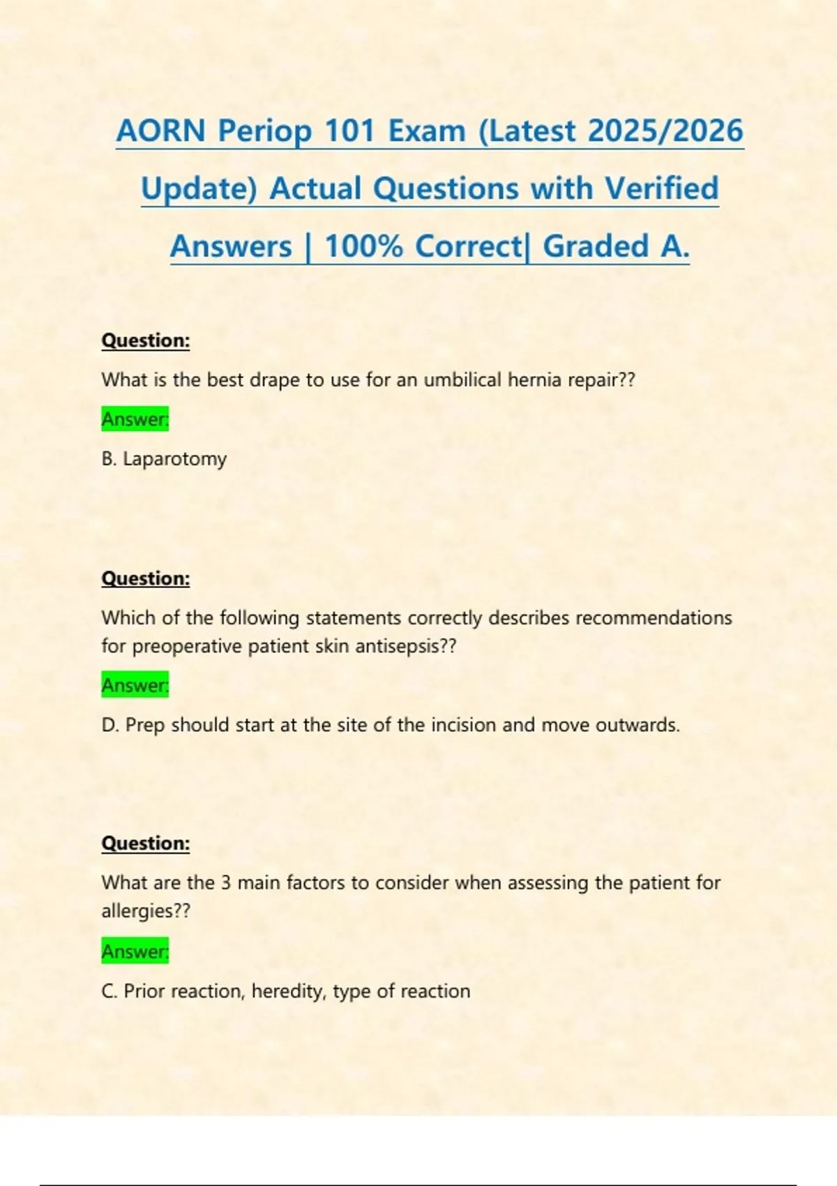 AORN Periop 101 Exams PACKAGE DEAL| BUNDLE contains the latest exam, Practice test, Final exam and updated study guide- Everything you need to pass AORN Periop 101 is here!!