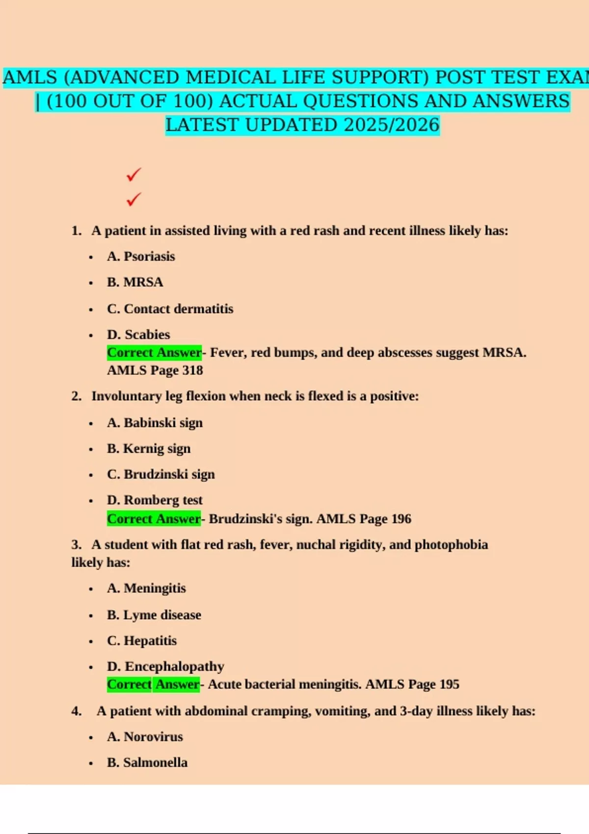 AMLS POST TEST EXAM: ADVANCED MEDICAL LIFE SUPPORT, 2025/2026 WITH CORRECT/ACCURATE ANSWERS AMLS (ADVANCED MEDICAL LIFE SUPPORT) POST TEST EXAM | (100 OUT OF 100) ACTUAL QUESTIONS AND ANSWERS LATEST UPDATED 2025/2026 AMLS PRETEST EXAM: ADVANCED MEDICAL LIFE SUPPORT, 2025/2026 WITH CORRECT/ACCURATE ANSWERS