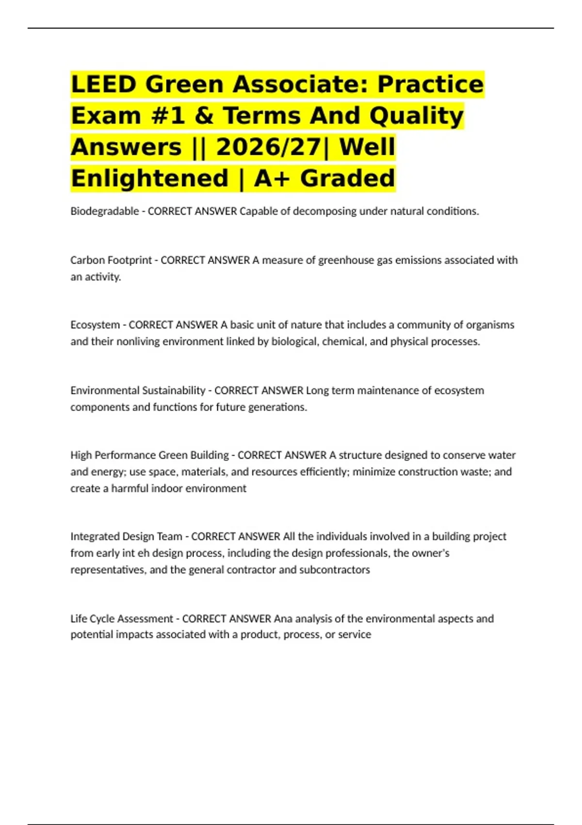 LEED Green Associate: Practice Exam #1 & Terms And Quality Answers || 2026/27| Well Enlightened | A+ Graded,LEED Green Associate Exam Questions Answered And Graded | 100% Pass!!,LEED Green Associate Practice Exam Questions Correctly Answered| A+ Rated | ACE THE TEST,LEED GA Exam – Questions And Complete Solutions | Fully Solved | 2026/27 || A+ Rate