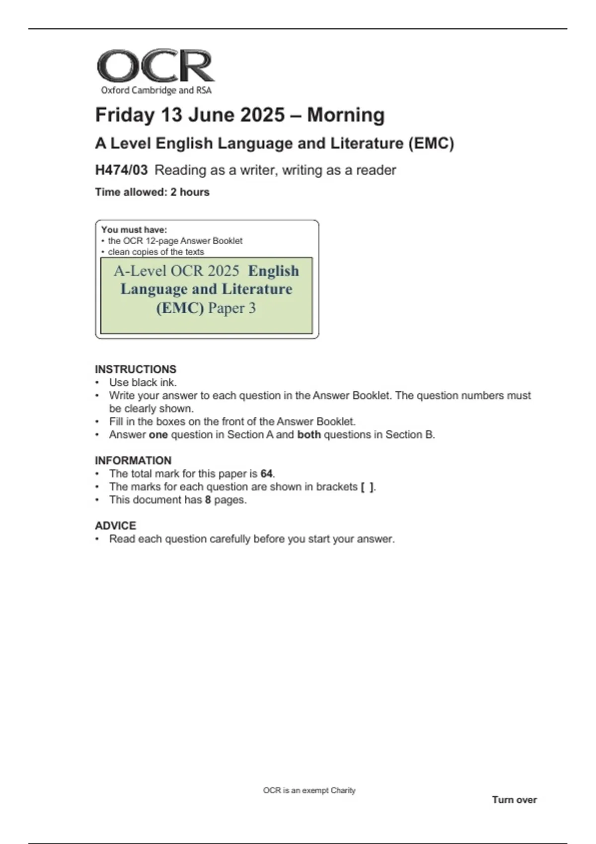 A-Level OCR 2025 English Language and Literature (EMC) Paper 3 Including Mark Scheme