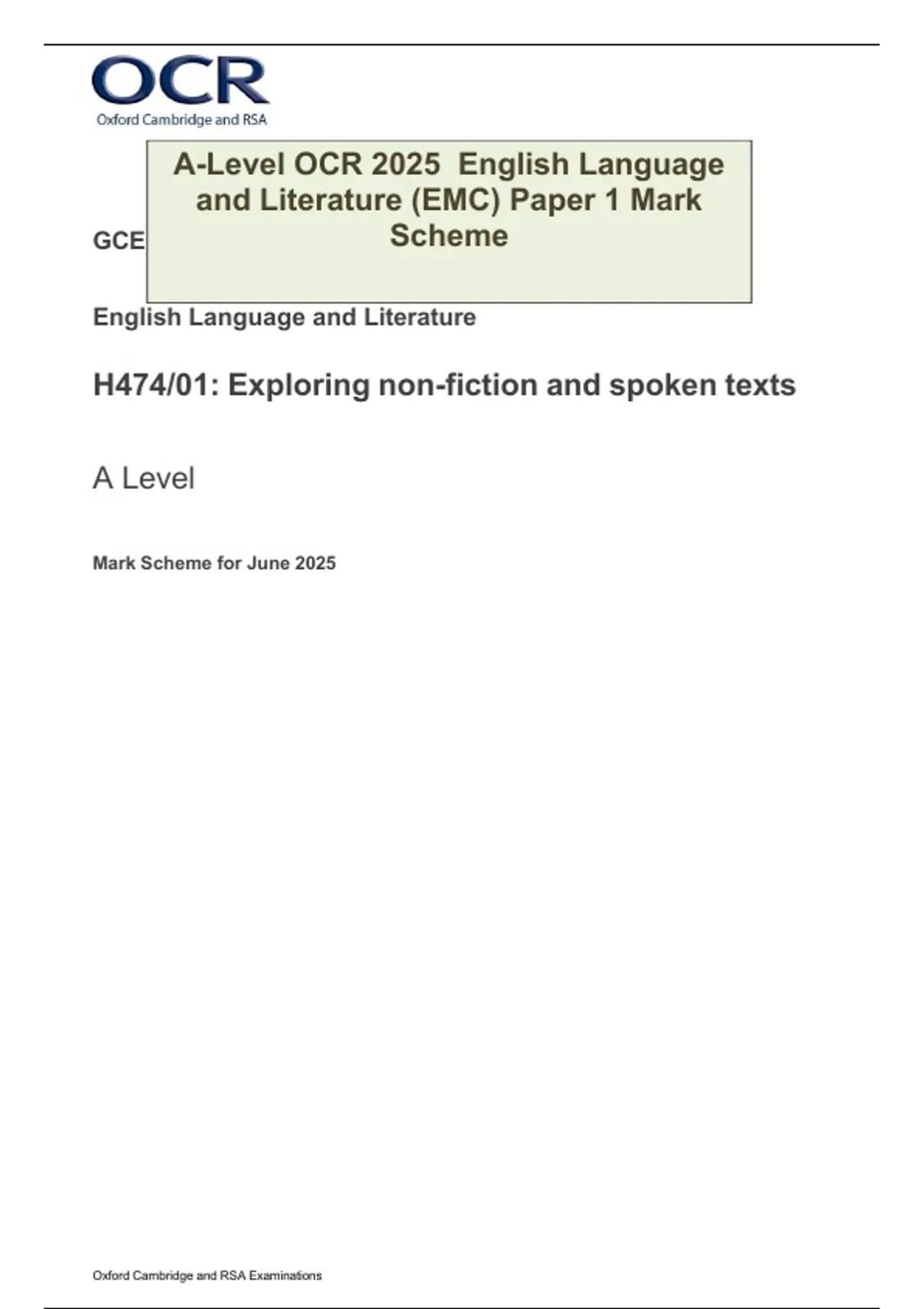 A-Level OCR 2025 English Language and Literature (EMC) Paper 1, 2, & 3 Mark Schemes