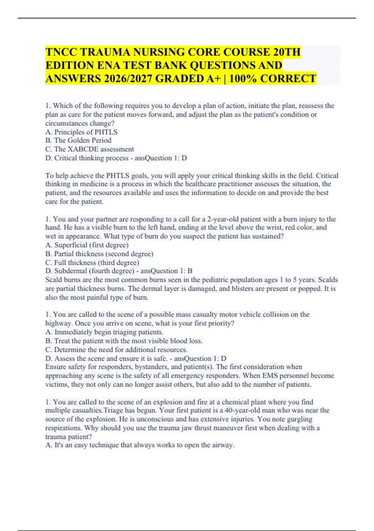 TNCC 9 TH EDITION EXAM ACTUAL VERIFIED EXAM TEST BANK, TNCC TRAUMA NURSING CORE COURSE ENA TEST BANK & TNCC ENA 9th Edition Pre Test Questions and Correct Answers | Latest Update 2026/2027 | Already Graded A+ | Guaranteed Pass.