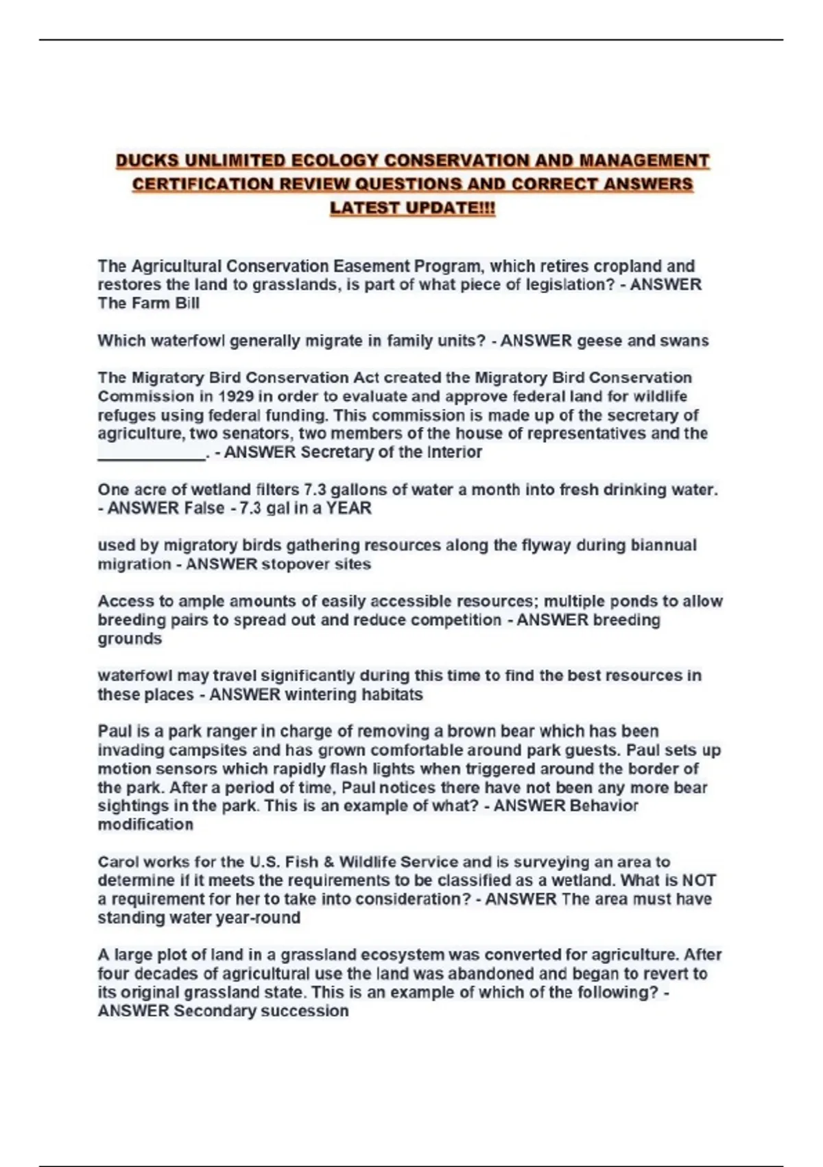 DUCKS UNLIMITED ECOLOGY CONSERVATION AND MANAGEMENT CERTIFICATION REVIEW QUESTIONS AND CORRECT ANSWERS!!