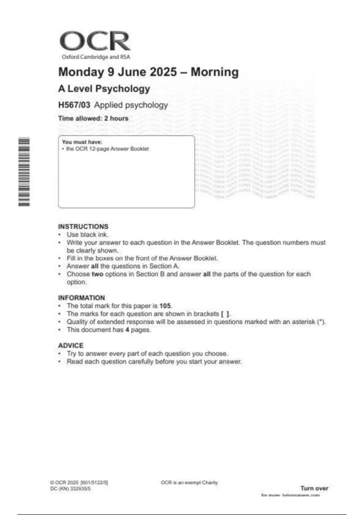 This file includes all four OCR A Level PSYCHOLOGY(H567) papers (1–3) from June 2025, merged with their official Question Papers and Mark Schemes. Perfect for quick revision, practising real exam questions, and understanding how marks are awarded across the full specification.