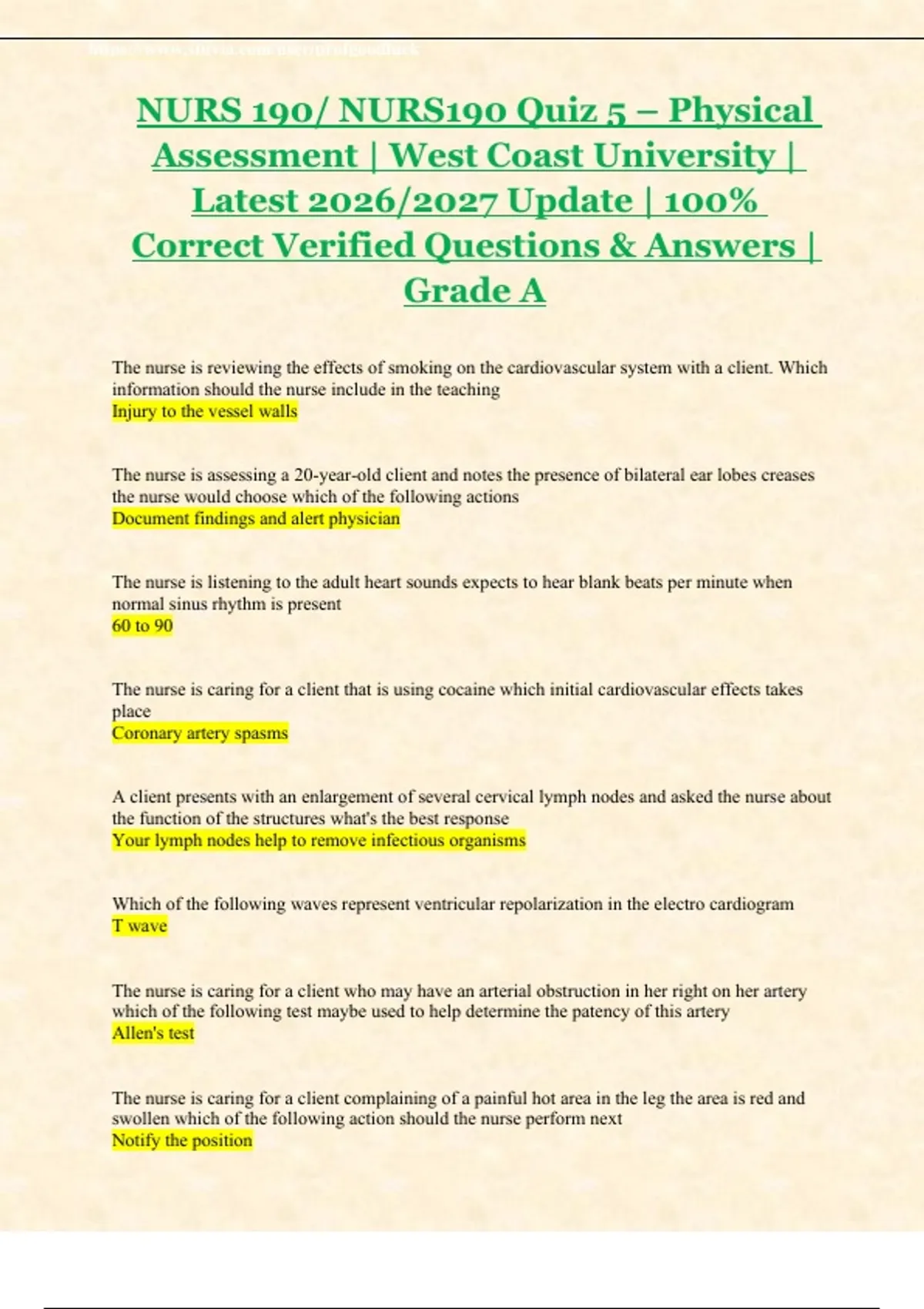 NURS190/ NURS 190 Study Bundle – Quizzes 4–5 | Physical Assessment | WCU 2026/2027 Updated Test Bank with Solutions | 100% Accurate | Grade A