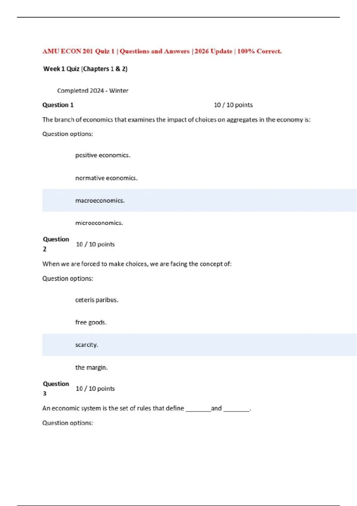 AMU ECON 201 Quiz 1 | Questions and Answers | 2026 Update | 100% Correct.