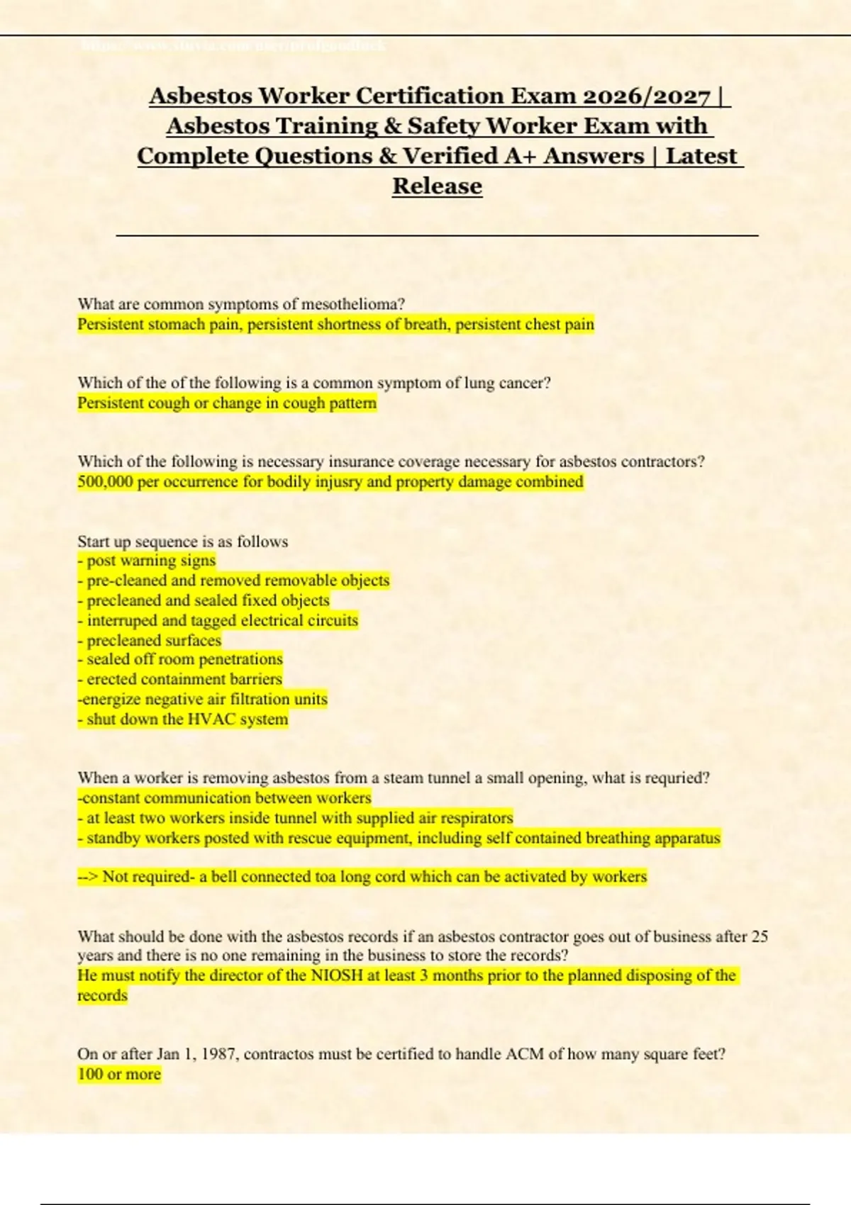 This Asbestos Worker Certification Exam Study Bundle provides a full set of realistic practice questions paired with verified correct answers, giving you everything you need to confidently prepare for the 2026/2027 certification cycle. Designed for individuals involved in asbestos removal, abatement, safety, and hazard control.