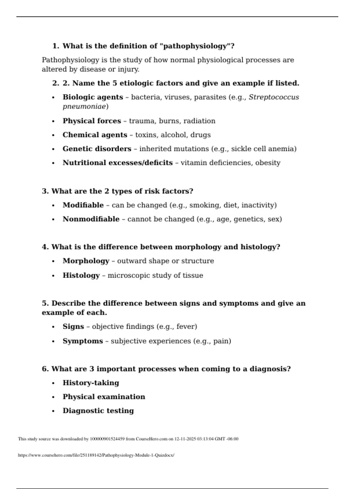 NURS 231 Pathophysiology Module 1 Quiz (Latest 2026/ 2027 Update) Review| 100% Verified Questions & Answers | Grade A