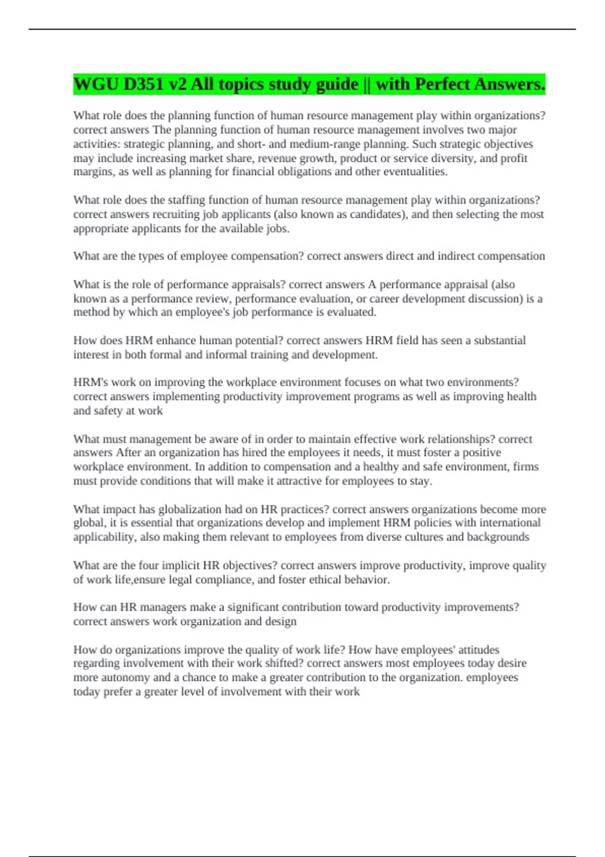 WGU D351 FUNCTIONS OF HUMAN RESOURCE MANAGEMENT PRE-ASSESSMENT QUESTIONS || ERRORLESS ANSWERS 100%. WGU D351 Know to Pass || A+ Certified. WGU D351 v2 All topics study guide || with Complete Solutions. WGU D351 || 100% Verified Solutions. WGU D351 v2 All topics study guide || with Perfect Answers.