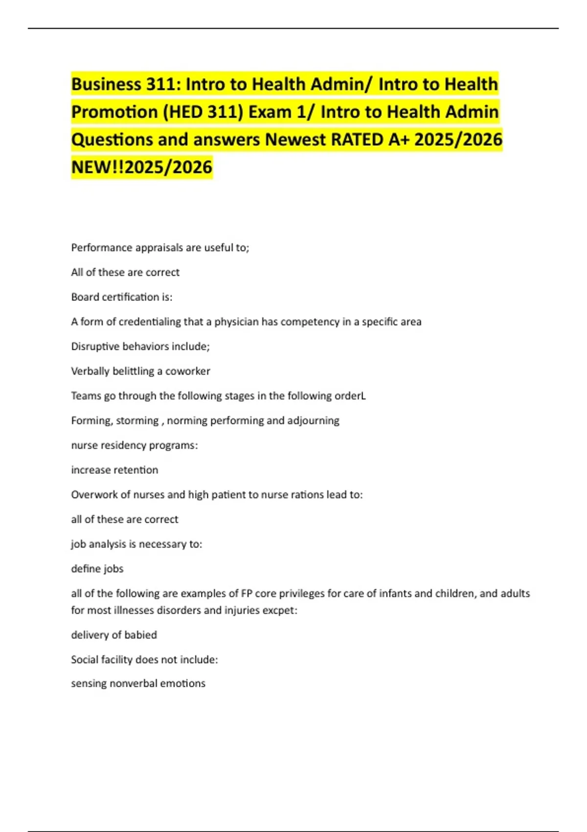 Exam (elaborations) HED 311 EXAM 1 WITH COMPLETE SOLUTION NEW EDITION UPDATED 100% PASS 2 Exam (elaborations) HED 311 Exam #1 Questions and answers With complete solution Updated 3 Exam (elaborations) HED 311 Exam 2/ HED 311 Exam 2 / 2 SETS COMBINED NEWEST RATED A+ 100% VERIFIED CORRECT 4 Exam (elaborations) Business 311: Intro to Health Admin/