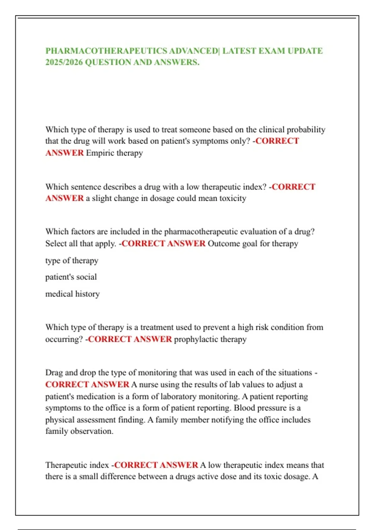 PHARMACOTHERAPEUTICS ADVANCED| LATEST EXAM UPDATE 2025/2026 QUESTION AND ANSWERS.