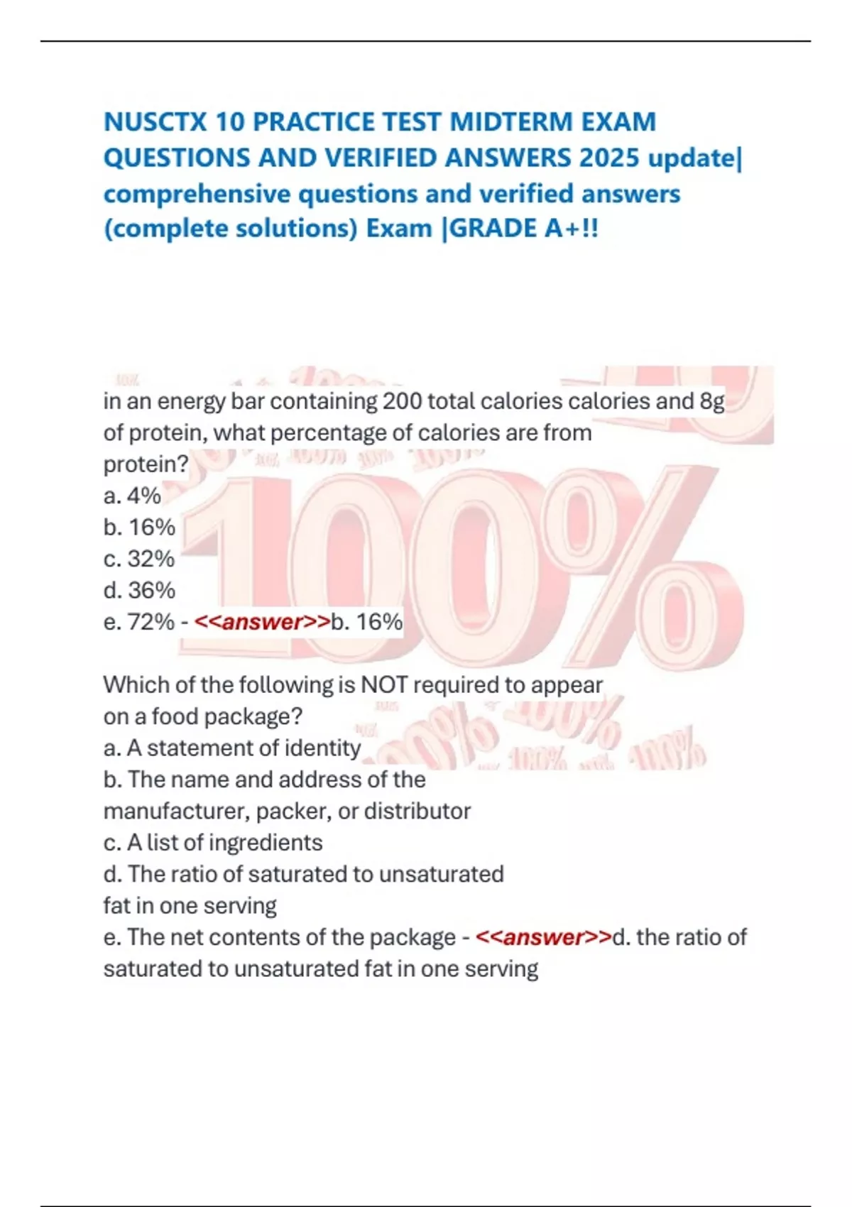 NUSCTX 10 PRACTICE TEST MIDTERM EXAM QUESTIONS AND VERIFIED ANSWERS 2025 update| comprehensive questions and verified answers (complete solutions) Exam |GRADE A+!! in an energy bar containing 200 total calories calories and 8g of protein, what percenta