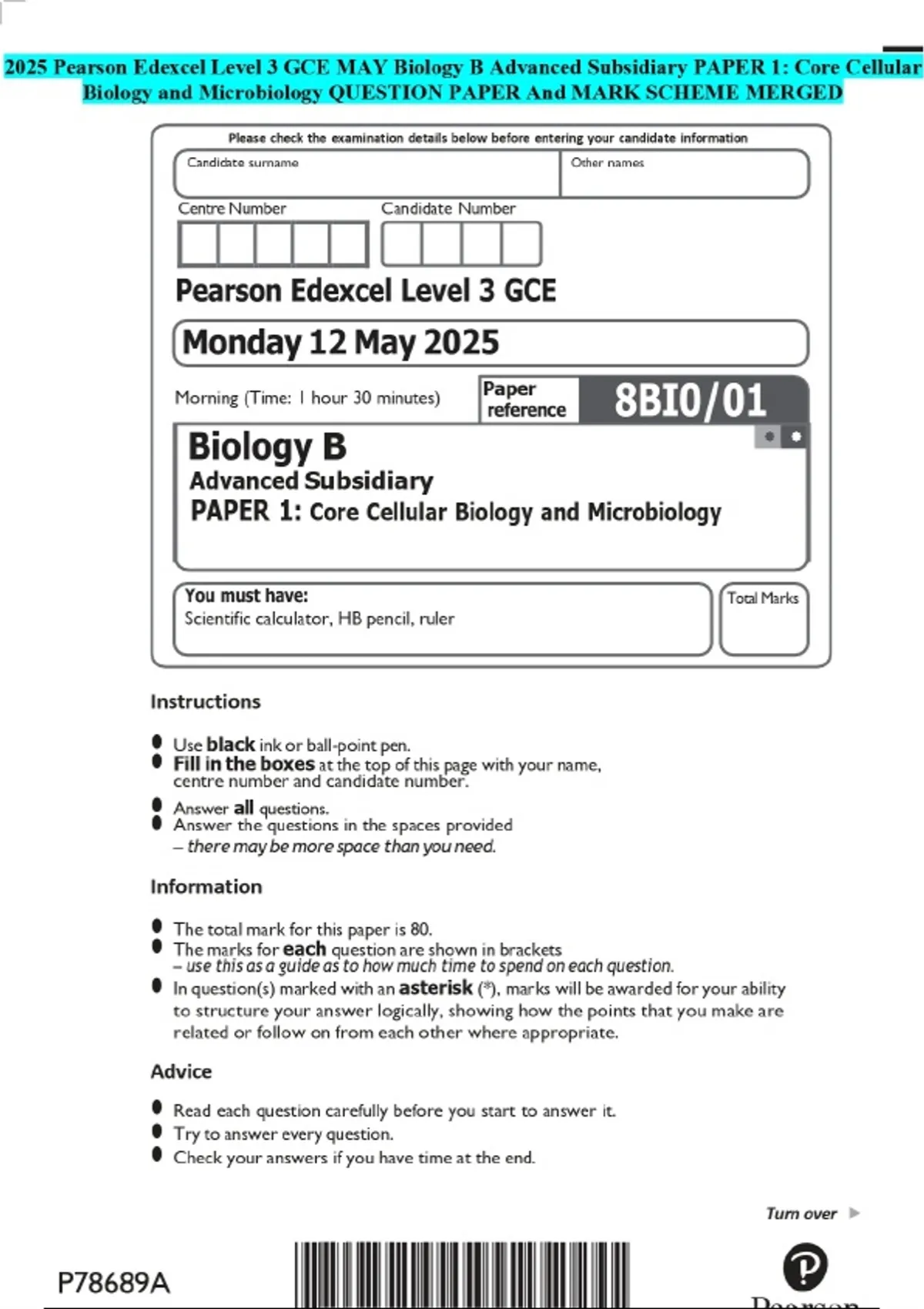 2025 Pearson Edexcel Level 3 GCE MAY Biology B Advanced Subsidiary PAPER 1: Core Cellular Biology and Microbiology QUESTION PAPER And MARK SCHEME MERGED