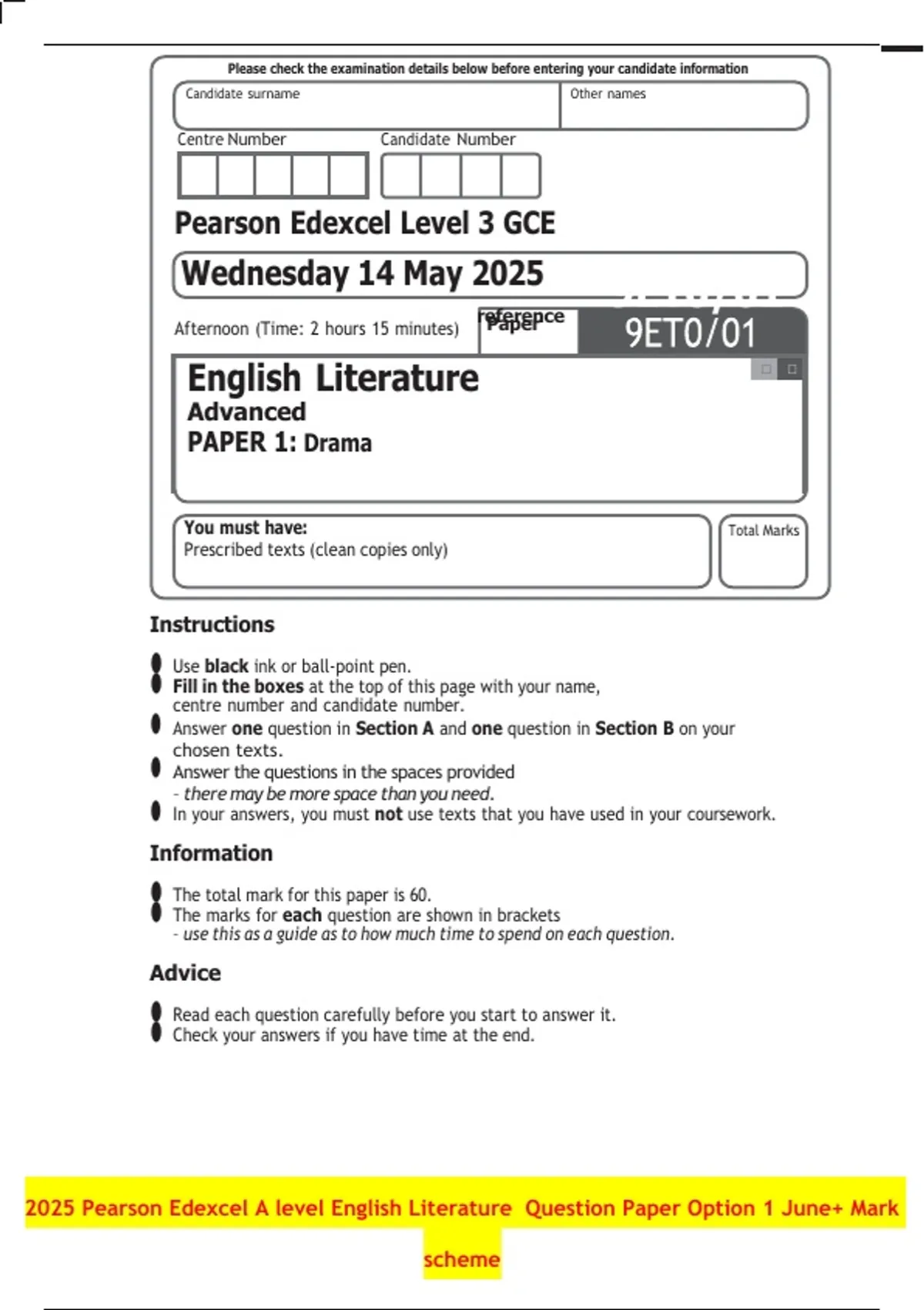 2025 Pearson Edexcel A level English Literature Question Paper Option 1 , 2 and 3 June + Mark scheme