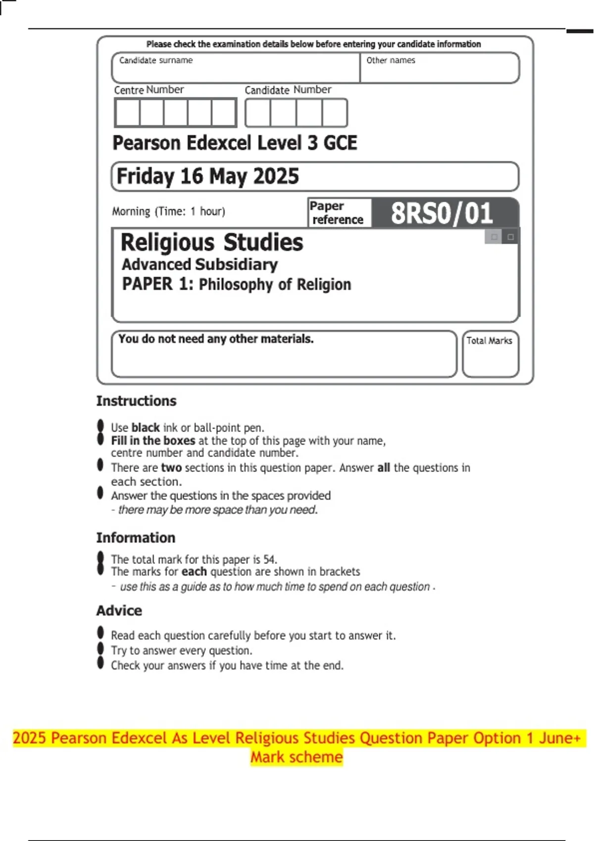 2025 Pearson Edexcel As Level Religious Studies Question Paper Option 1 June + Mark scheme