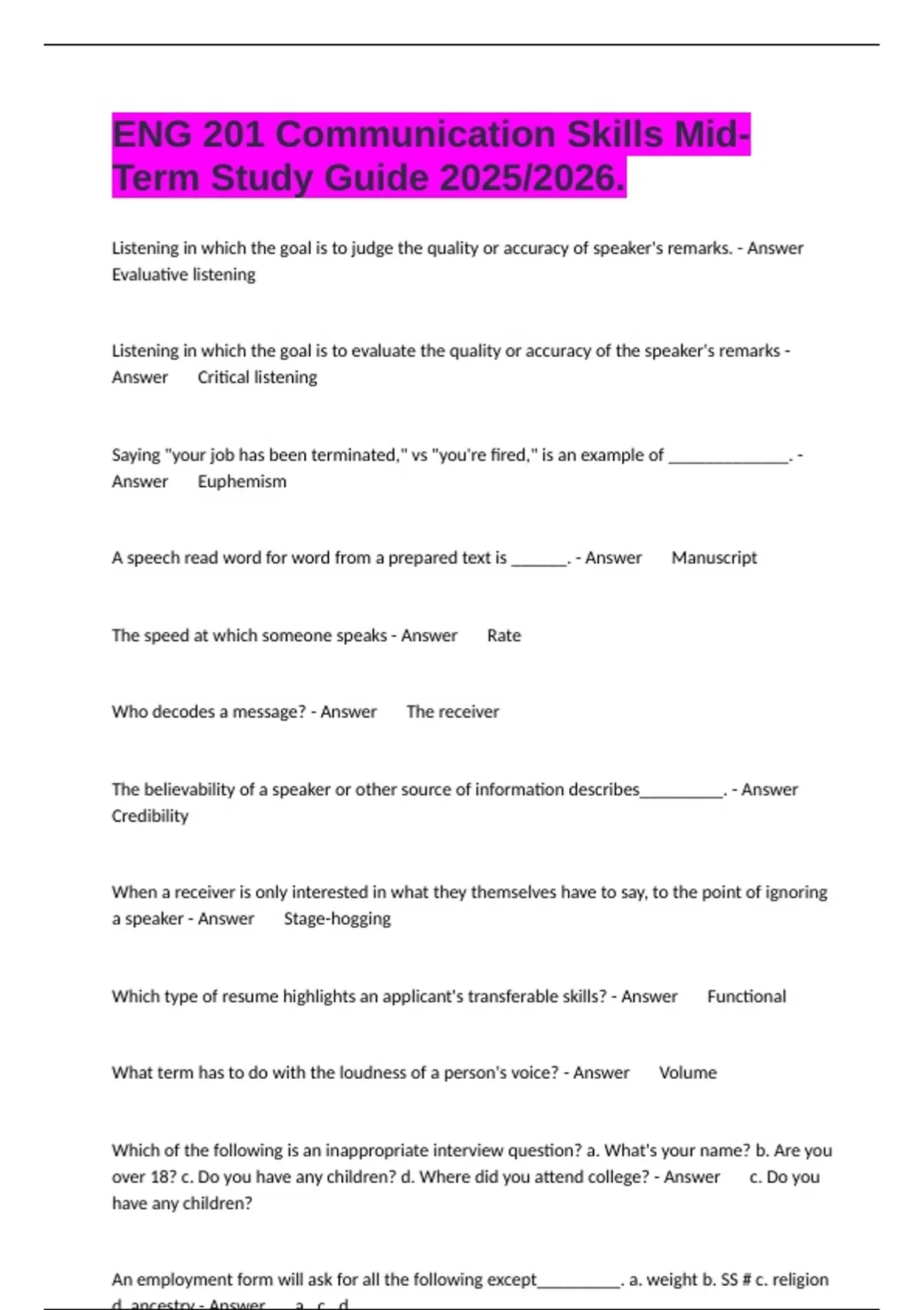 1 Exam (elaborations) English Composition 1 ENG201 – Handbook Questions All Answered Correct 2025/2026 Updated. 2 Exam (elaborations) English Comp ENG201 Latest Test Questions with Complete Correct Solutions Updated. 3 Exam (elaborations) English Comp 1 Final Review Questions All Solved Correct Updated.