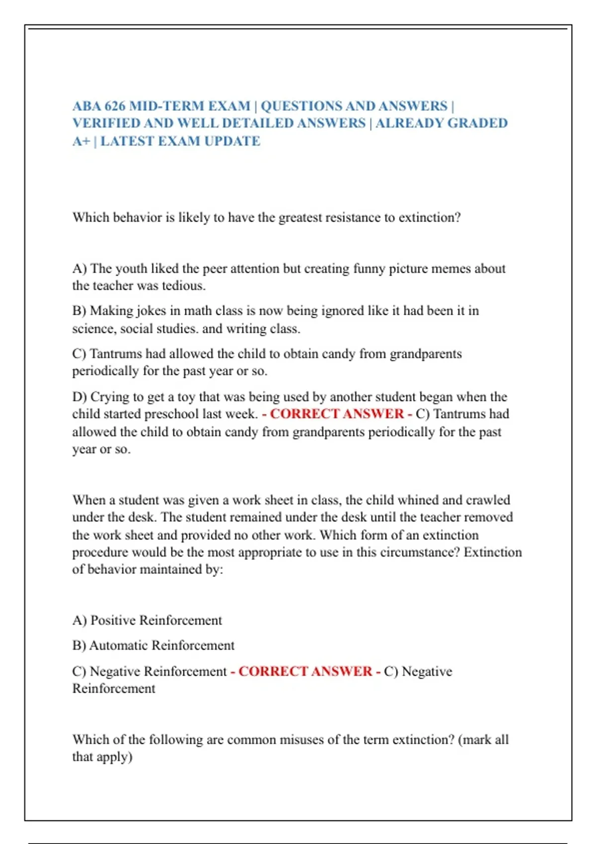 ABA 626 MIDTERM BEHAVIOR CHANGE PROCEDURES EXAM | QUESTIONS AND ANSWERS | VERIFIED ANSWERS GRADED A+ | LATEST EXAM UPDATE