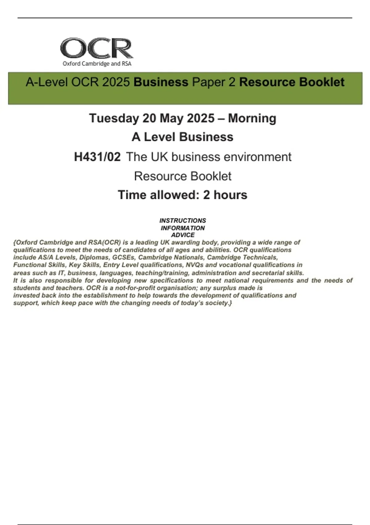 A-Level OCR 2025 Business Paper 2 Including Mark Scheme & Resource Booklet