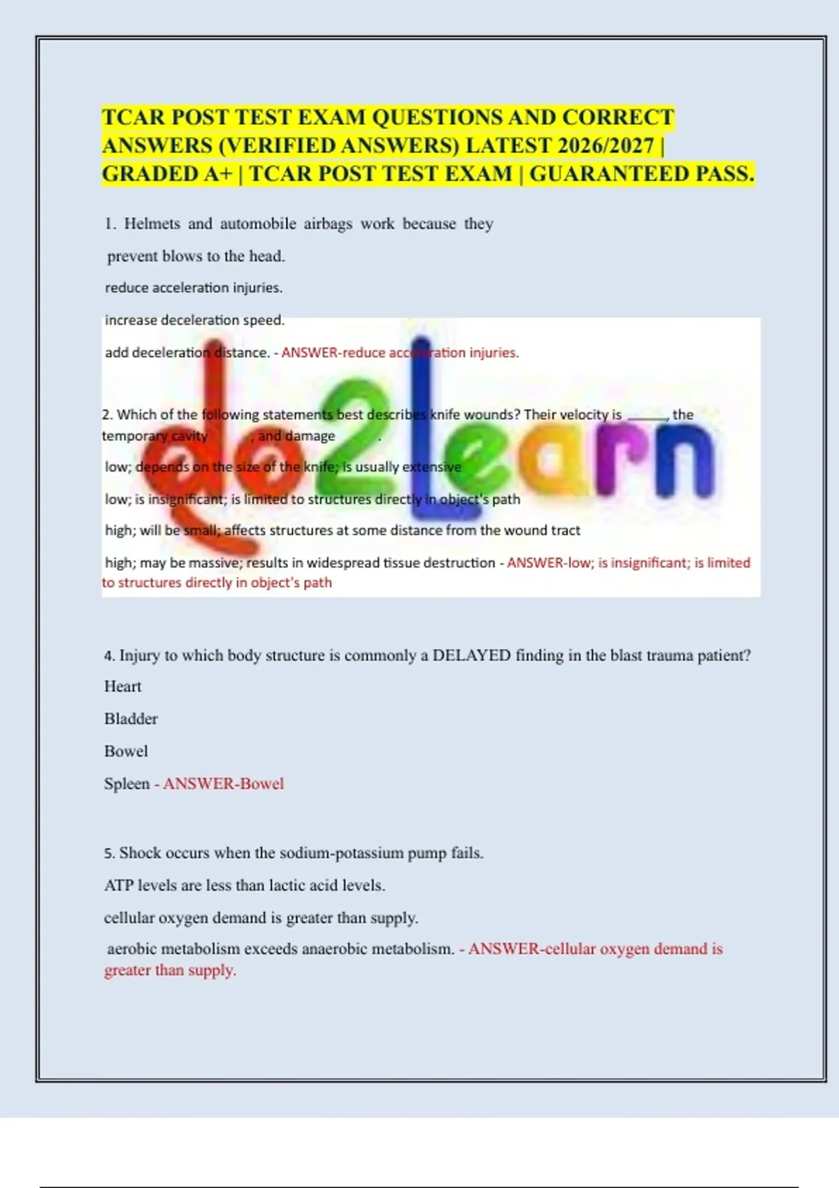 TCAR POST TEST EXAM QUESTIONS AND CORRECT ANSWERS (VERIFIED ANSWERS) LATEST 2026/2027 | TCAR POST TEST EXAM / ACTUAL EXAM QUESTIONS AND CORRECT ANSWERS WITH RATIONALES & TCAR POST TEST EXAM | ACTUAL EXAM QUESTIONS AND CORRECT ANSWERS | LATEST UPDATE 2026/2027 | GRADED A+ | NEW | 100% GUARANTEED PASS.