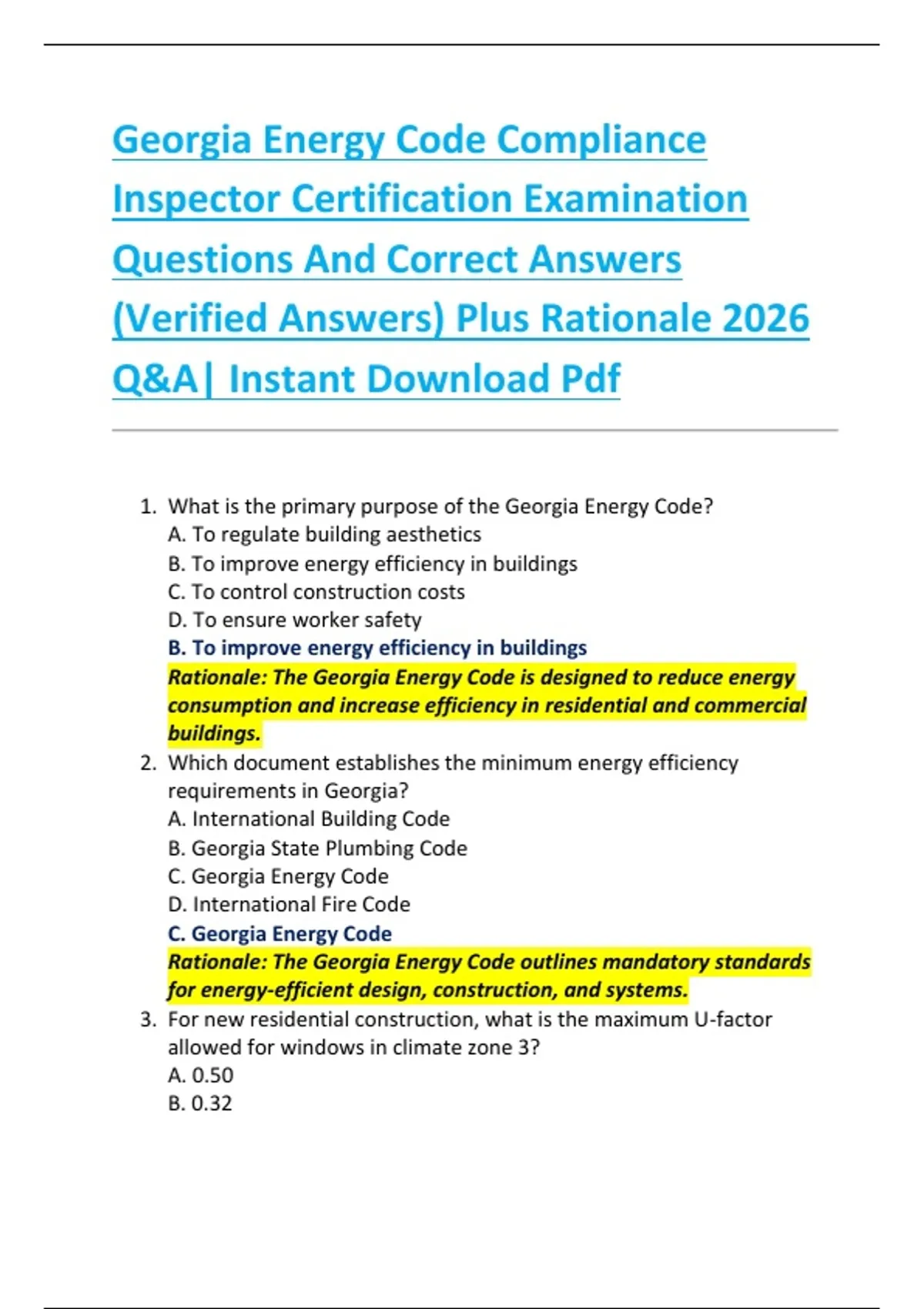 Compilation Bundle for Georgia Energy Code Compliance Inspector Certification Examinations Questions And Correct Answers (Verified Answers) Plus Rationale 2026 Q&A| Instant Download Pdf