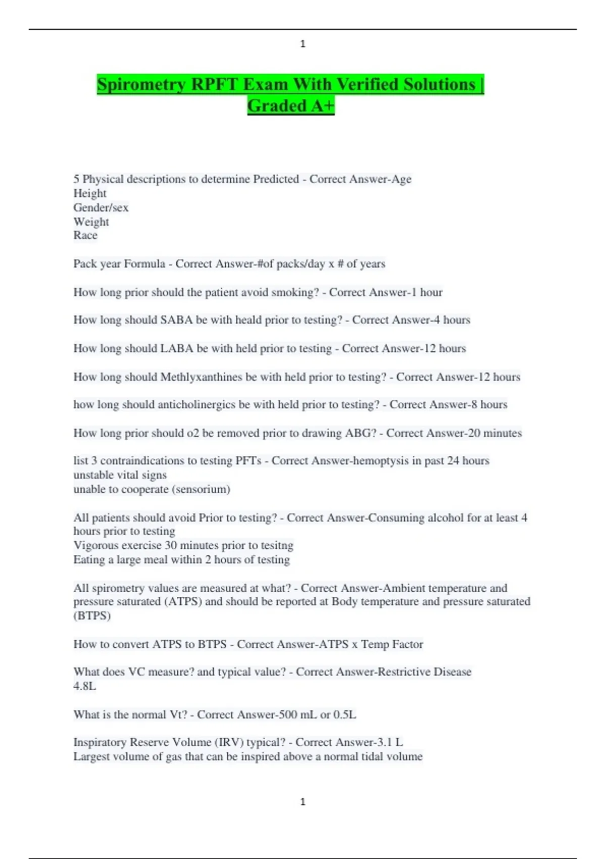 CPFT-RPFT Normal Values Exams With Correct Questions and Answers