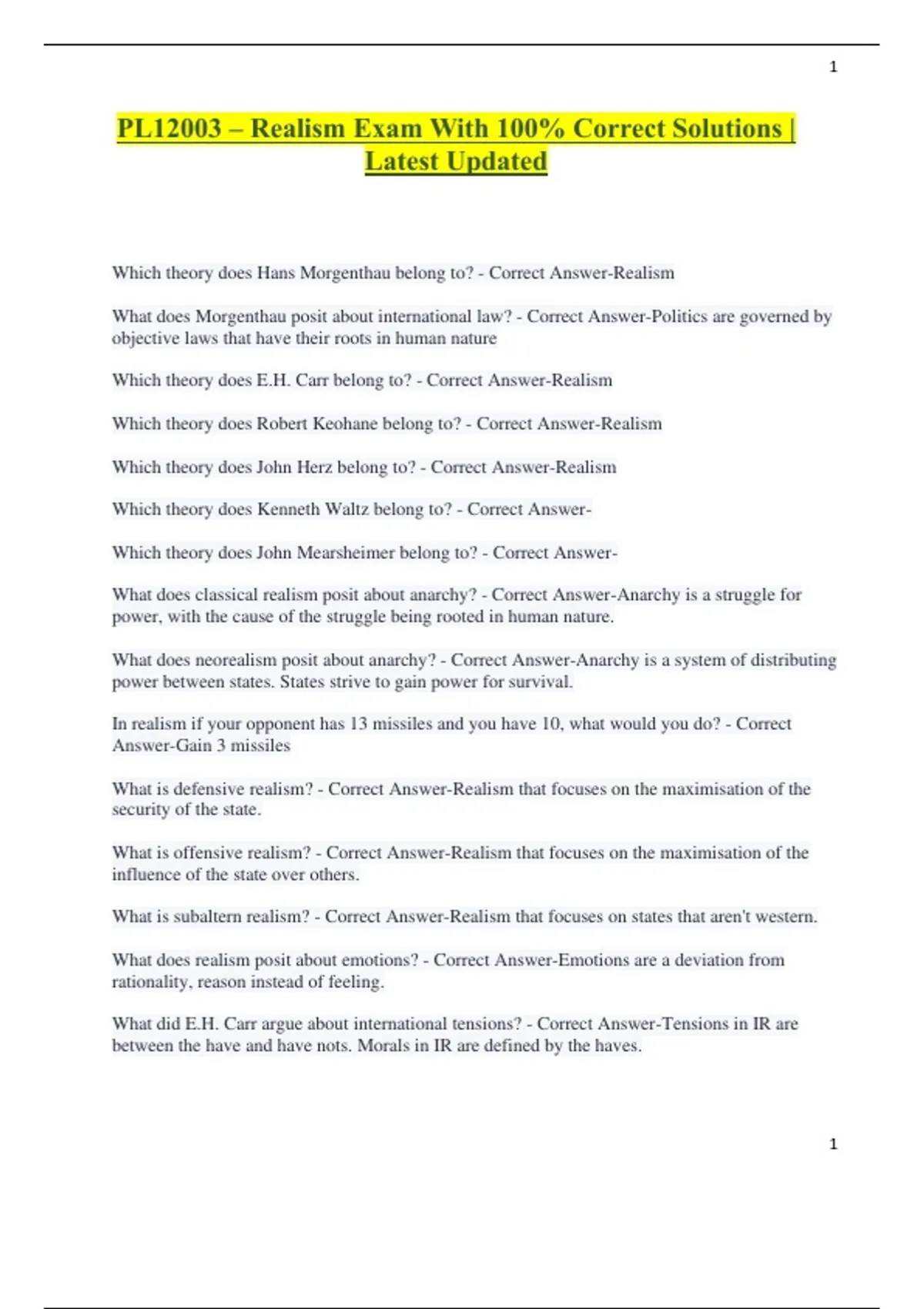 Realism In International Relation Exams With Correct Questions and Detailed Answers