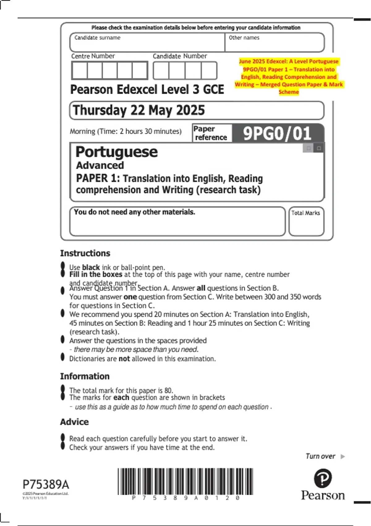 June 2025 Edexcel A Level Portuguese (9PGO) | Combined Question Papers & Mark Schemes.