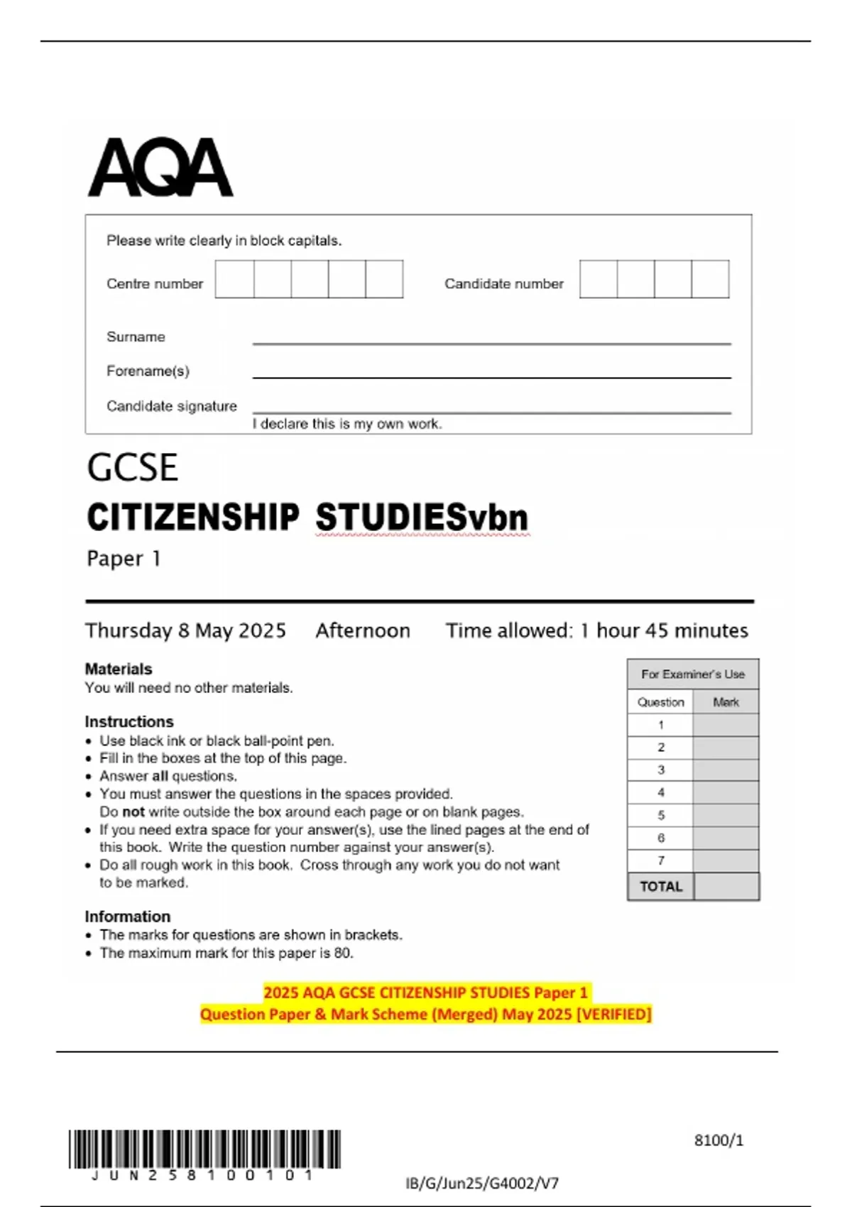 May 2025 AQA GCSE Citizenship Studies | Combined Question Papers & Mark Schemes.