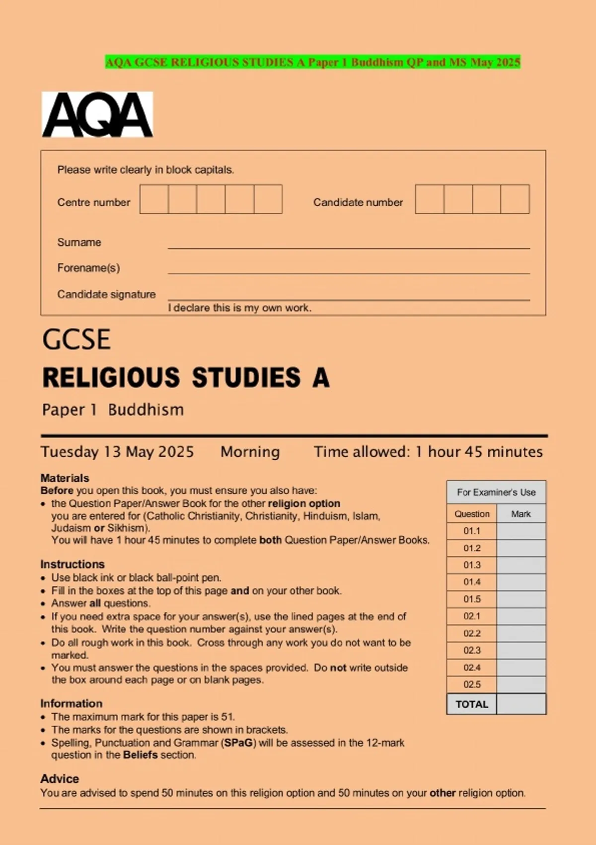 AQA GCSE RELIGIOUS STUDIES A Paper 1 Buddhism QP and MS May 2025