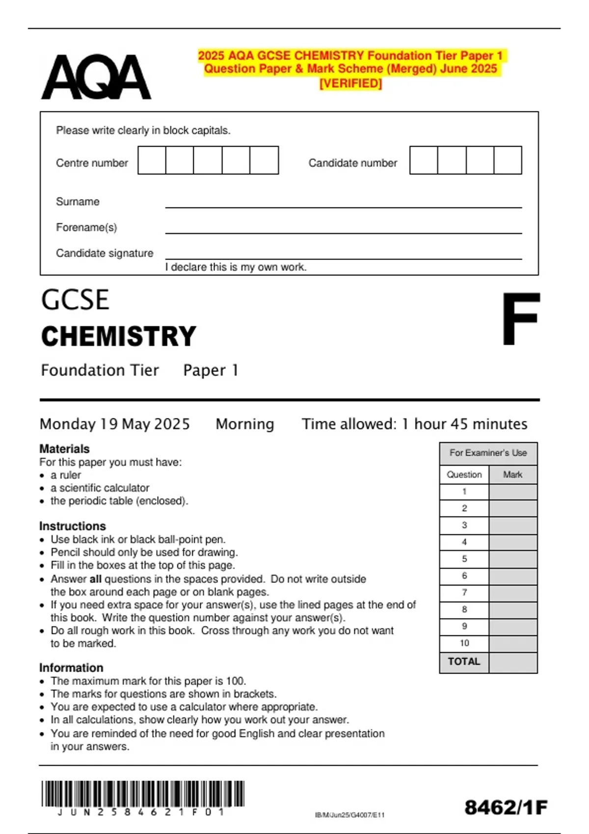 June 2025 AQA GCSE Chemistry (Foundation Tier) | Combined Question Papers & Mark Schemes