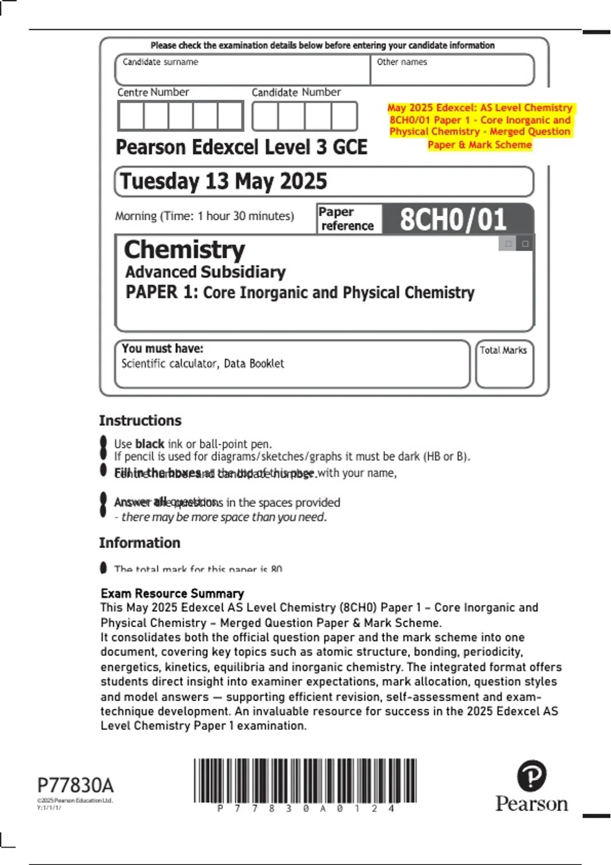 This bundle includes all May 2025 Edexcel AS Level Chemistry (8CH0) papers — Paper 1: Core Inorganic and Physical Chemistry and Paper 2: Core Organic and Physical Chemistry — with merged question papers and official mark schemes, providing a complete and reliable resource for exam revision and practice.