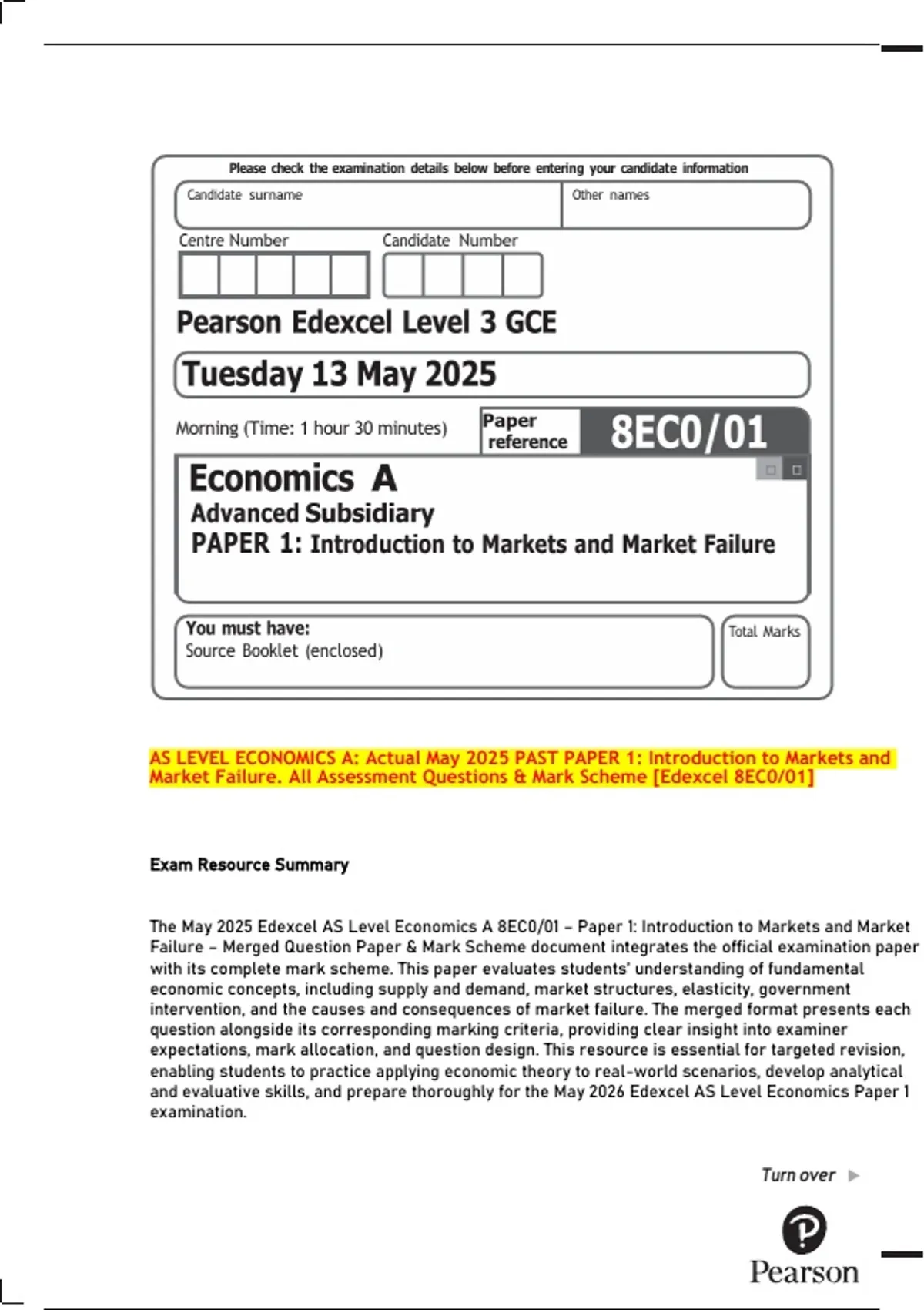 This bundle includes all May 2025 Edexcel AS Economics A (8EC0) papers — Paper 1: Introduction to Markets and Market Failure, and Paper 2: The UK Economy: Performance and Policies — with full assessment questions and official mark schemes, providing a complete and reliable resource for exam revision and practice.