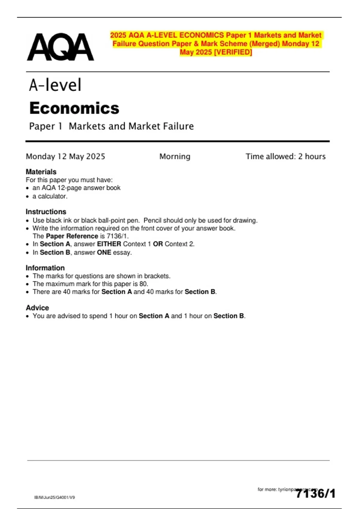 This bundle includes all May–June 2025 AQA A-Level Economics papers — Paper 1: Markets and Market Failure, Paper 2: National and International Economy, and Paper 3: Economic Principles and Issues — with merged question papers and official mark schemes, providing a complete and reliable resource for exam revision and practice.