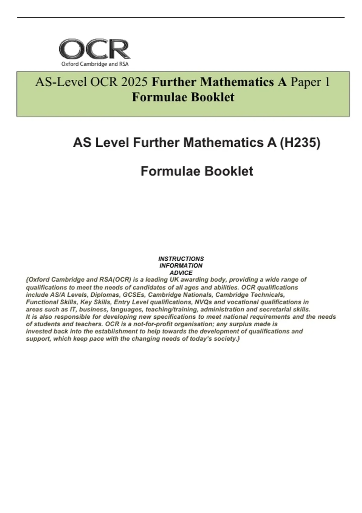 AS-Level OCR 2025 Further Mathematics A Formulae Booklet