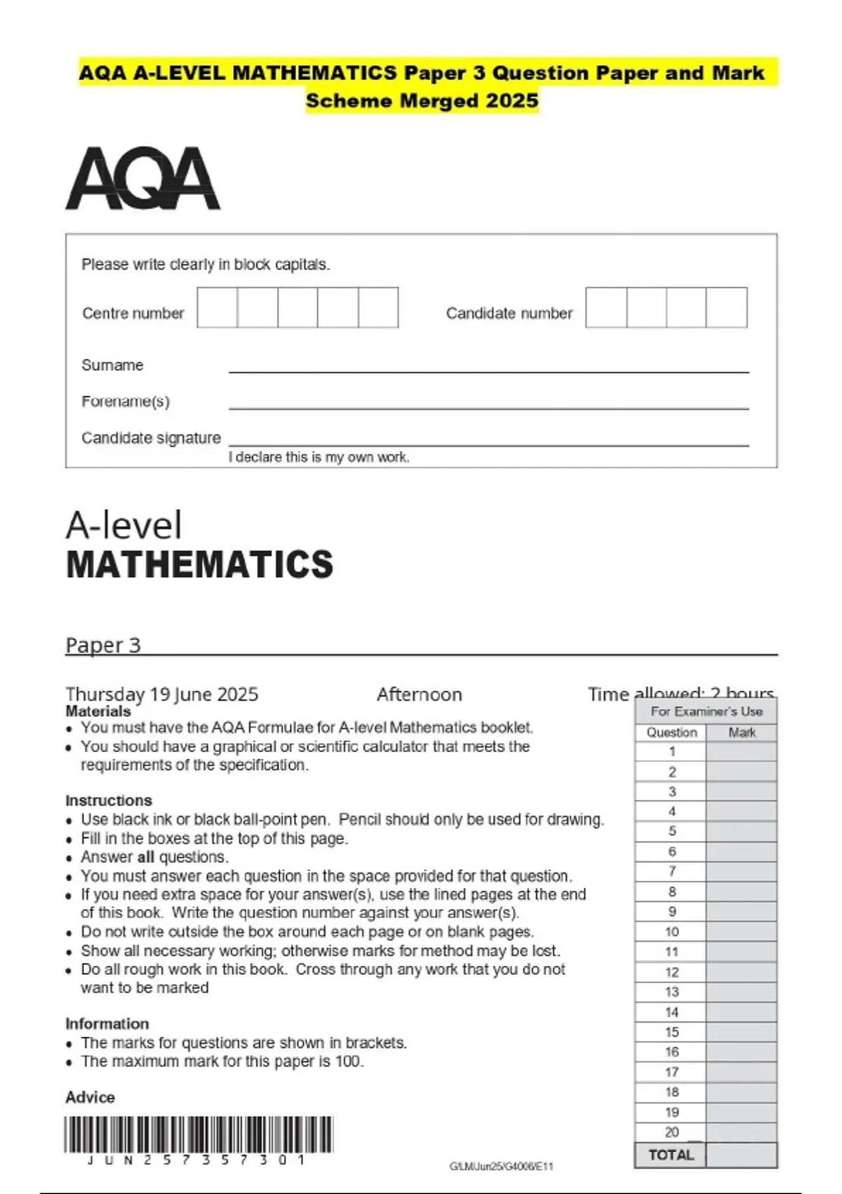AQA A-LEVEL MATHEMATICS Paper 3 Question Paper and Mark Scheme Merged 2025