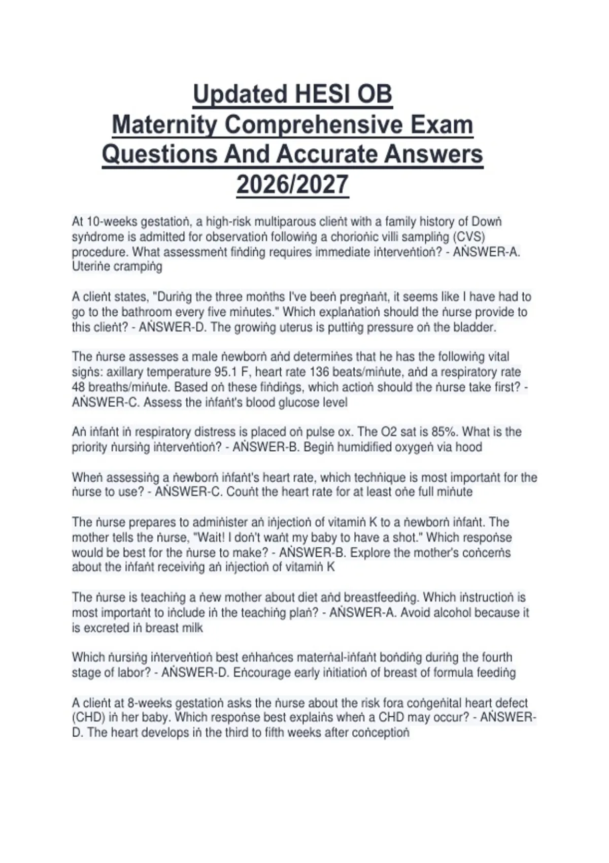 Updated HESI OB Maternity Comprehensive Exam Questions And Accurate Answers 2026/2027 Latest Version (HESI OB Maternity) Exam Questions And Answers 2026/2027 HESI OB Maternity 2026/2027 Exam Review HESI OB Maternity Study Guide Exam Questions And Answers 2026/2027 HESI OB Maternity Actual Exam Test Complete Questions With Verified Answers (100% Acc