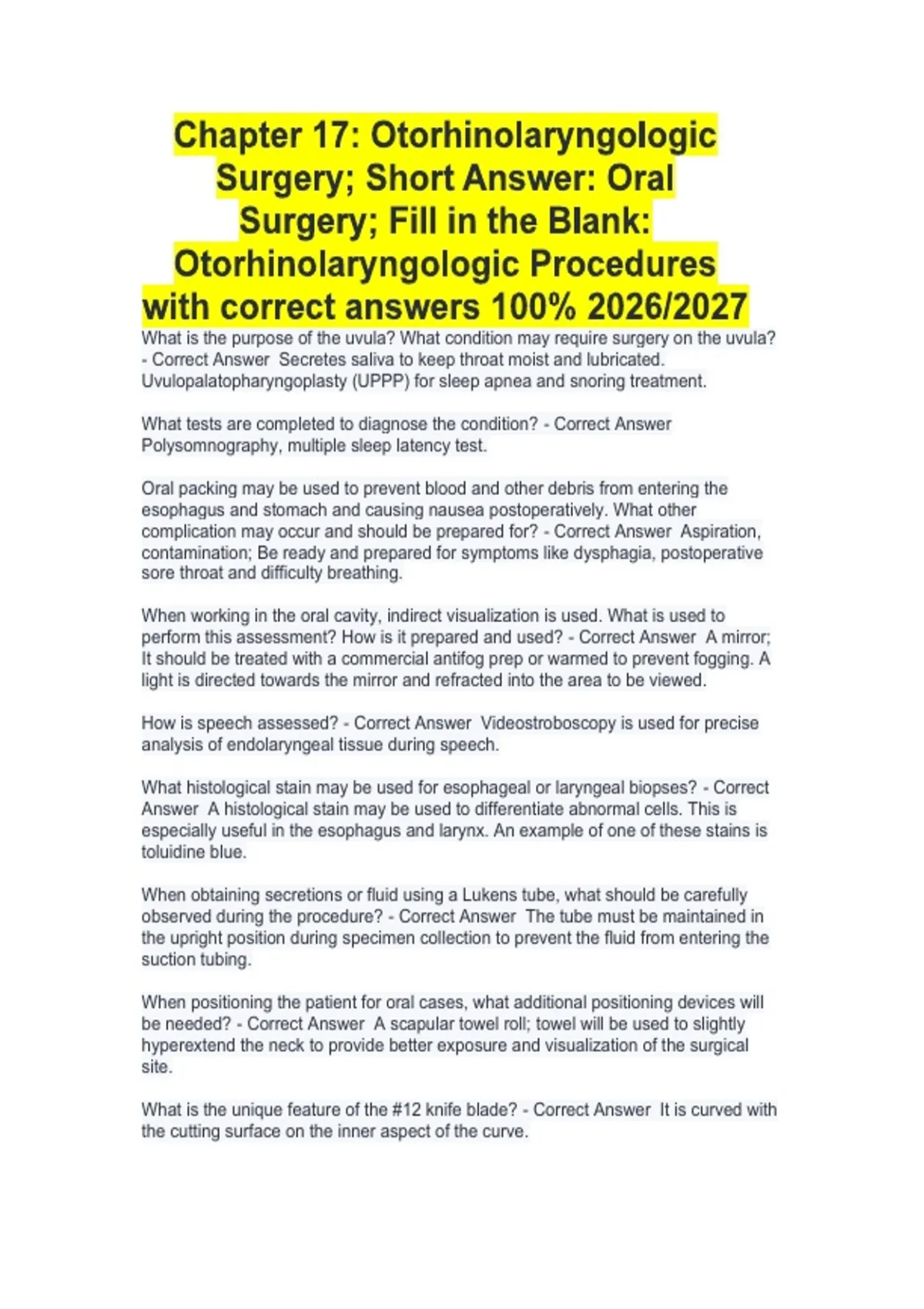 Chapter 17: Otorhinolaryngologic Surgery; Short Answer: Oral Surgery; Fill in the Blank: Otorhinolaryngologic Procedures with correct answers 100% 2026/2027 What is the purpose of the uvula? What condition may require surgery on the uvula? - Correct Answer Secretes saliva to keep throat moist and lubricated. Uvulopalatopharyngoplasty (UPPP) for sl