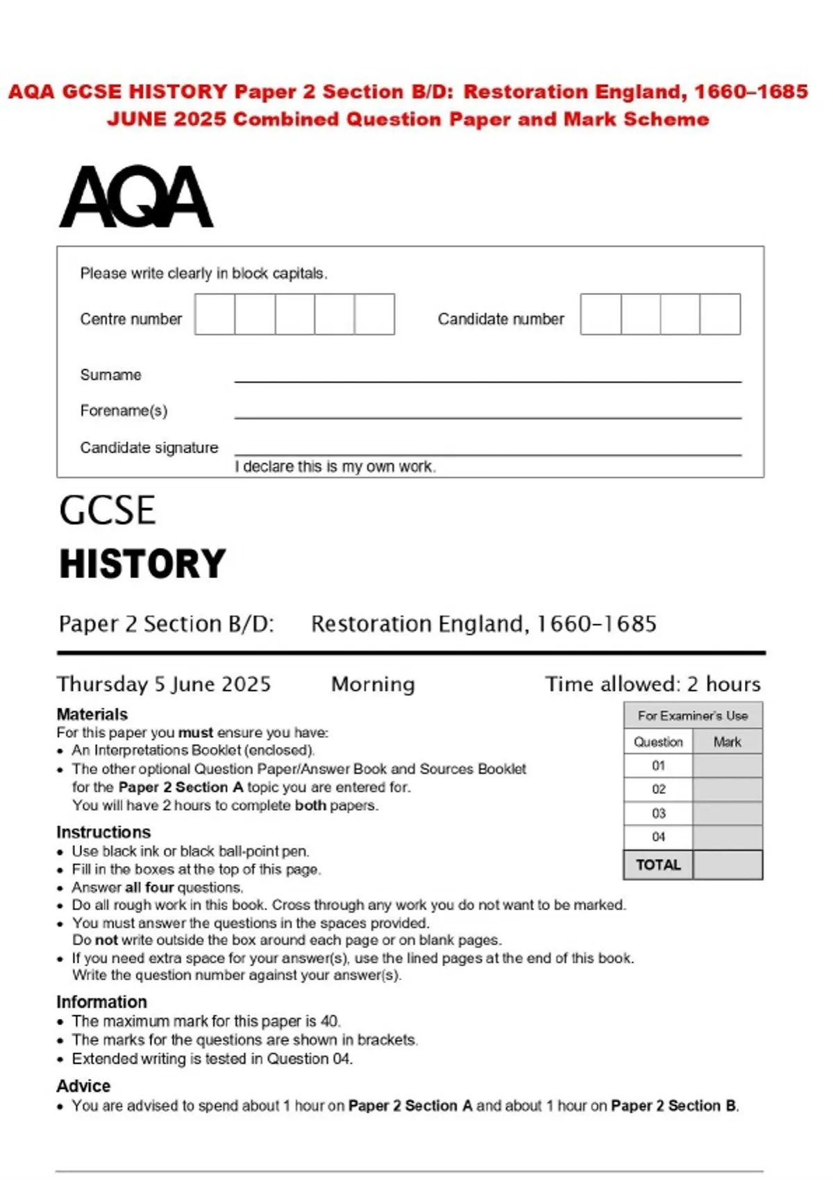 AQA GCSE HISTORY Paper 2 Section B/D: Restoration England, 1660–1685 JUNE 2025 Combined Question Paper and Mark Scheme